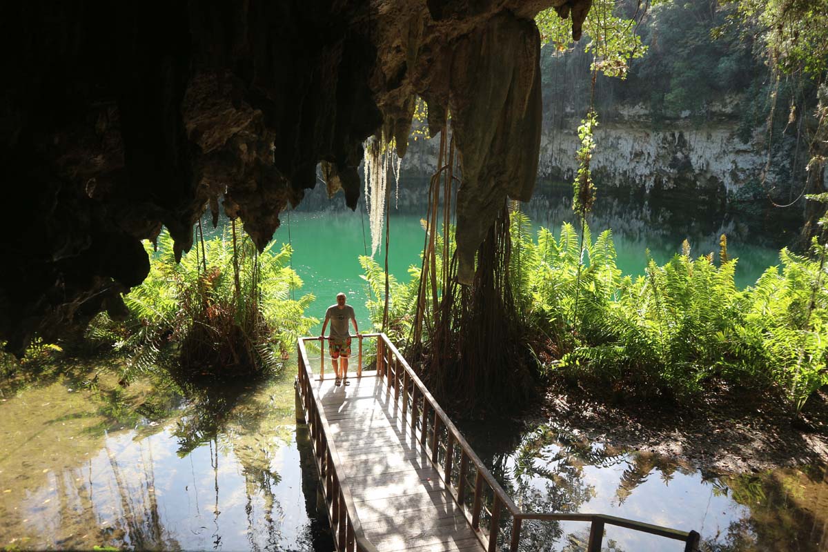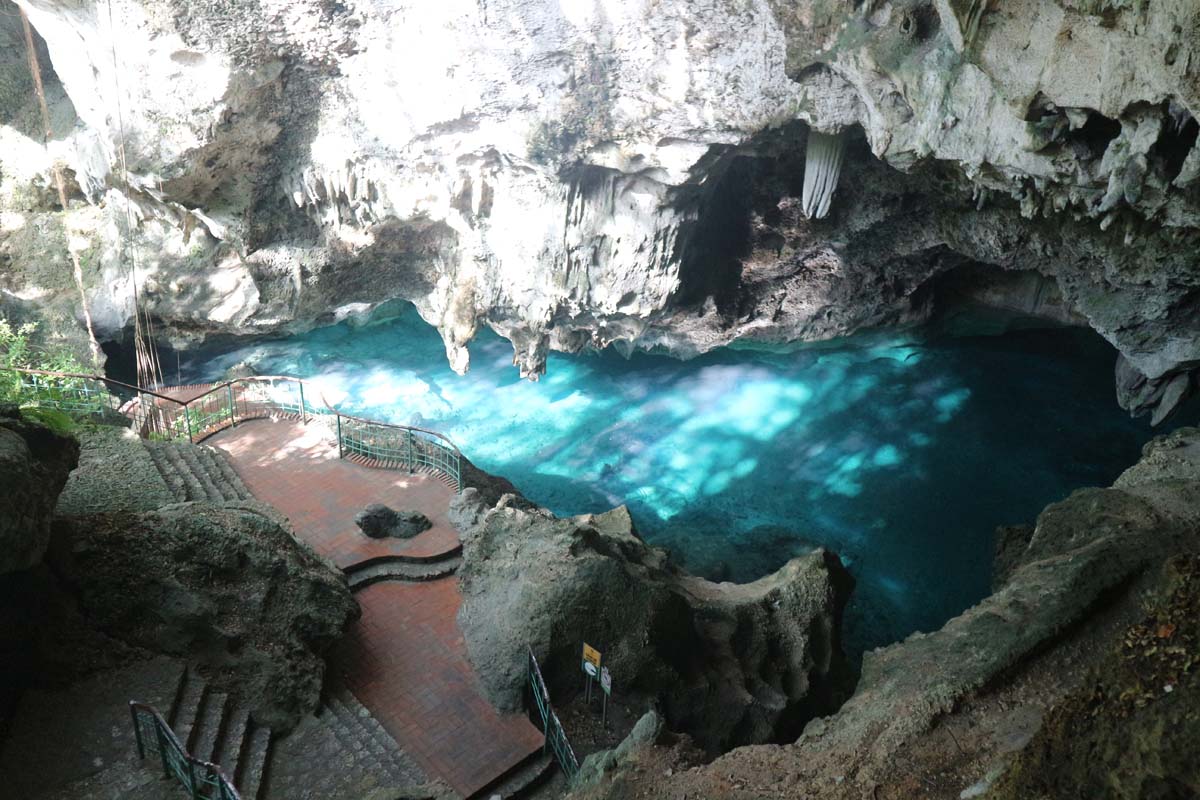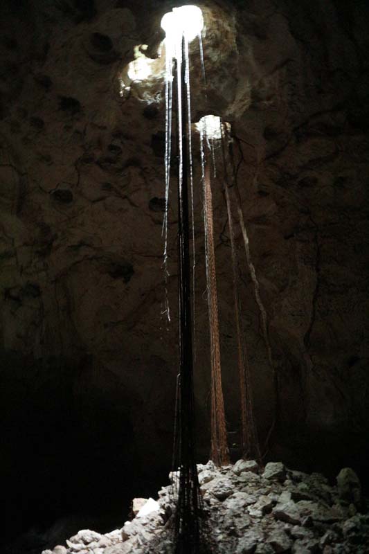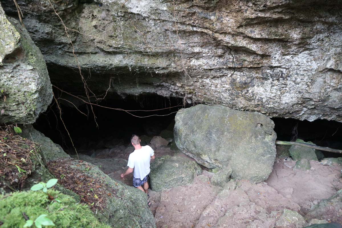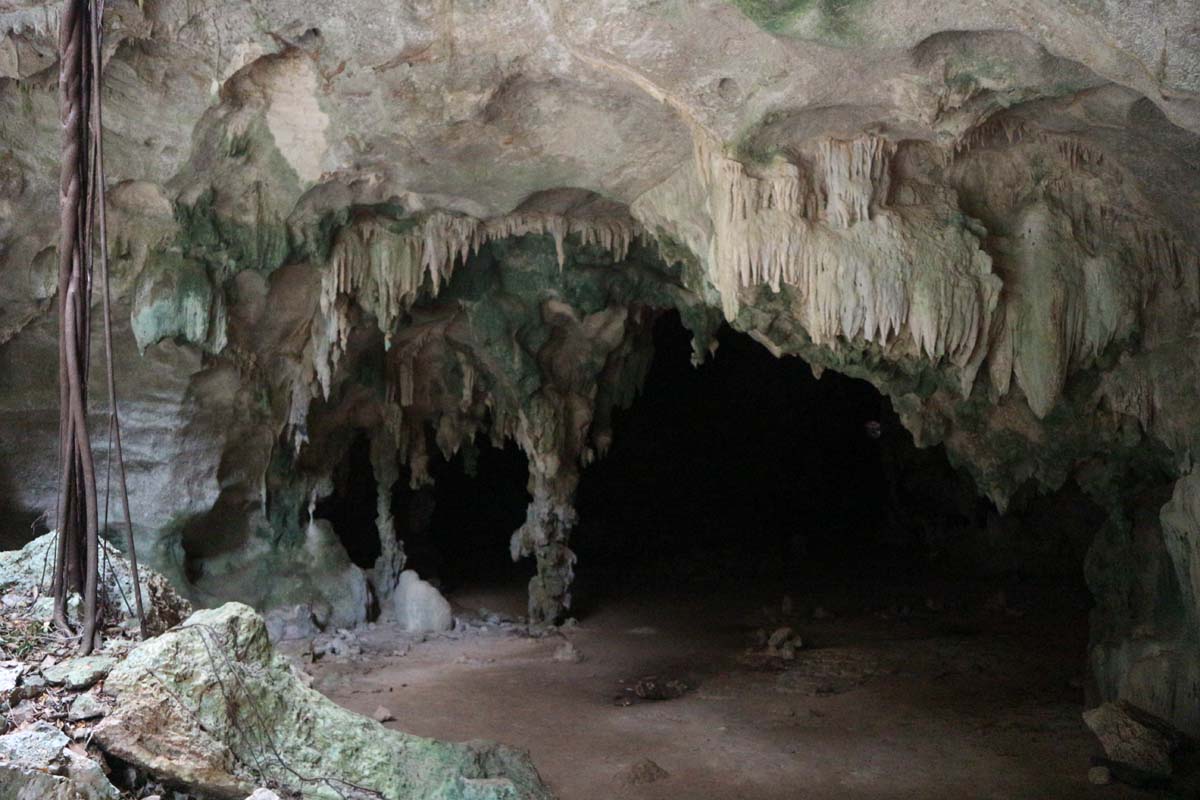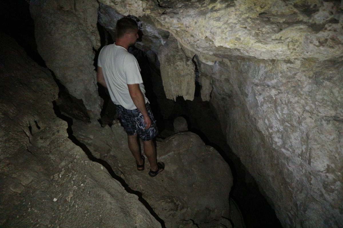 Начебто печер на маршруті повинно бути чотири, але зараз відкрито лише останні дві. За відгуками у попередніх взагалі нічого робити. А ось останні обіцяють бути цікавими. Ще до речі у них тут у джунглях ефектні кактусові ліси. До печери ми дісталися, якби не табличка, то я б у житті не ризикнув туди лізти. Вхід виглядав зловісно. Було дві печери що поряд, з’єднані підземним озером. Табличка говорила, що дайвери можуть пропливти 600 метрів і виринути в іншій печері. Але мені уявити складно, як хтось сюди тягне все дайверське обладнання. Ситуація класична, у найближчі пару кілометрів із людей лише охоронець, що збирає гроші. Перед нами темний вхід, далі темрява і як належить сталактити зі сталагмітами. Я викрикнув у середину голосне “У”, а у відповідь почув писк кажанів. Що ж, зараз буде цікаво.