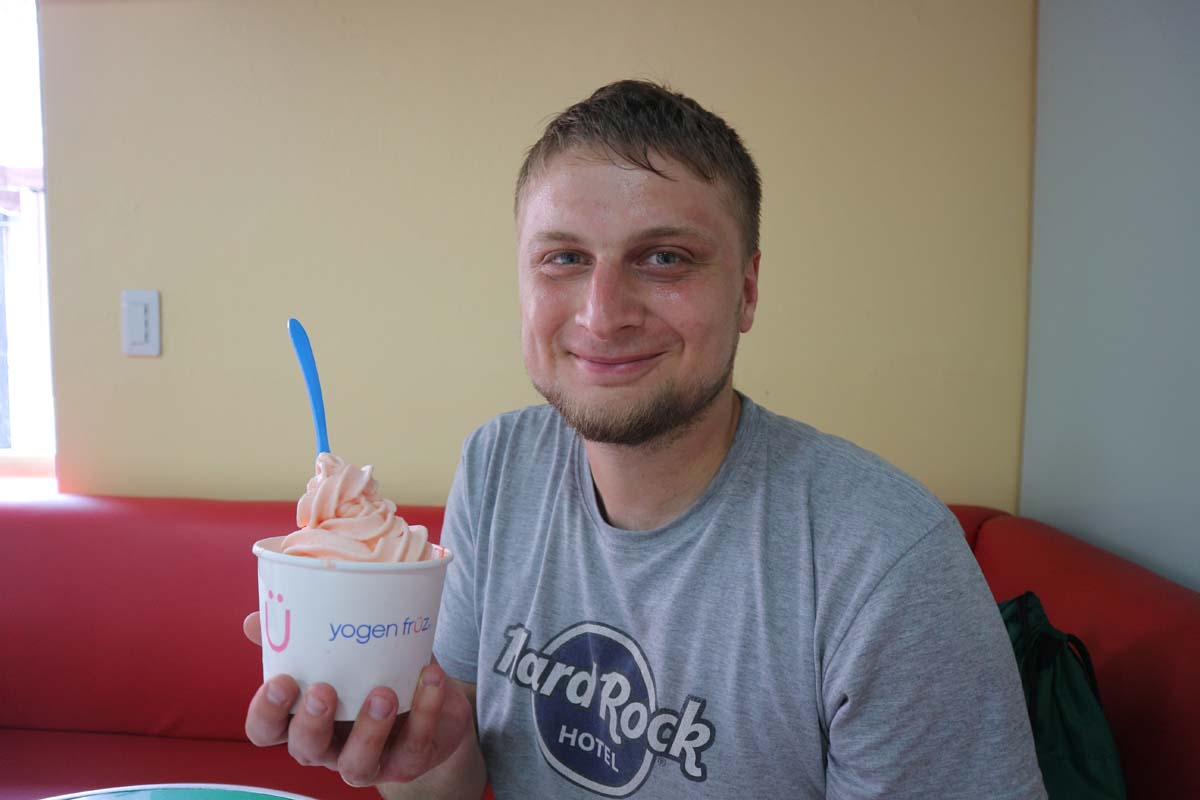 Також ми поповнили свій рейтинг відвіданих макдональдсів. Увечері у кафе, де роблять заморожені йогурти, я замовив собі дуже цікавий фруктовий йогурт. Даша у мене запитала, який із фруктів відчувається найбільше, я помітив, що фрукти тут взагалі не відчуваються, і в цей момент іншій дівчині вручили мій йогурт. Була німа сцена, вона глянула на мене, а я з ложкою її йогурту в роті дивився на неї. Загалом, касир трохи переплутала домініканку зі мною, коли видавала замовлення. Я дуже люблю заморожені йогурти. У Санто Домінго за 220 песо (4,5 $) наливають значне відерце.