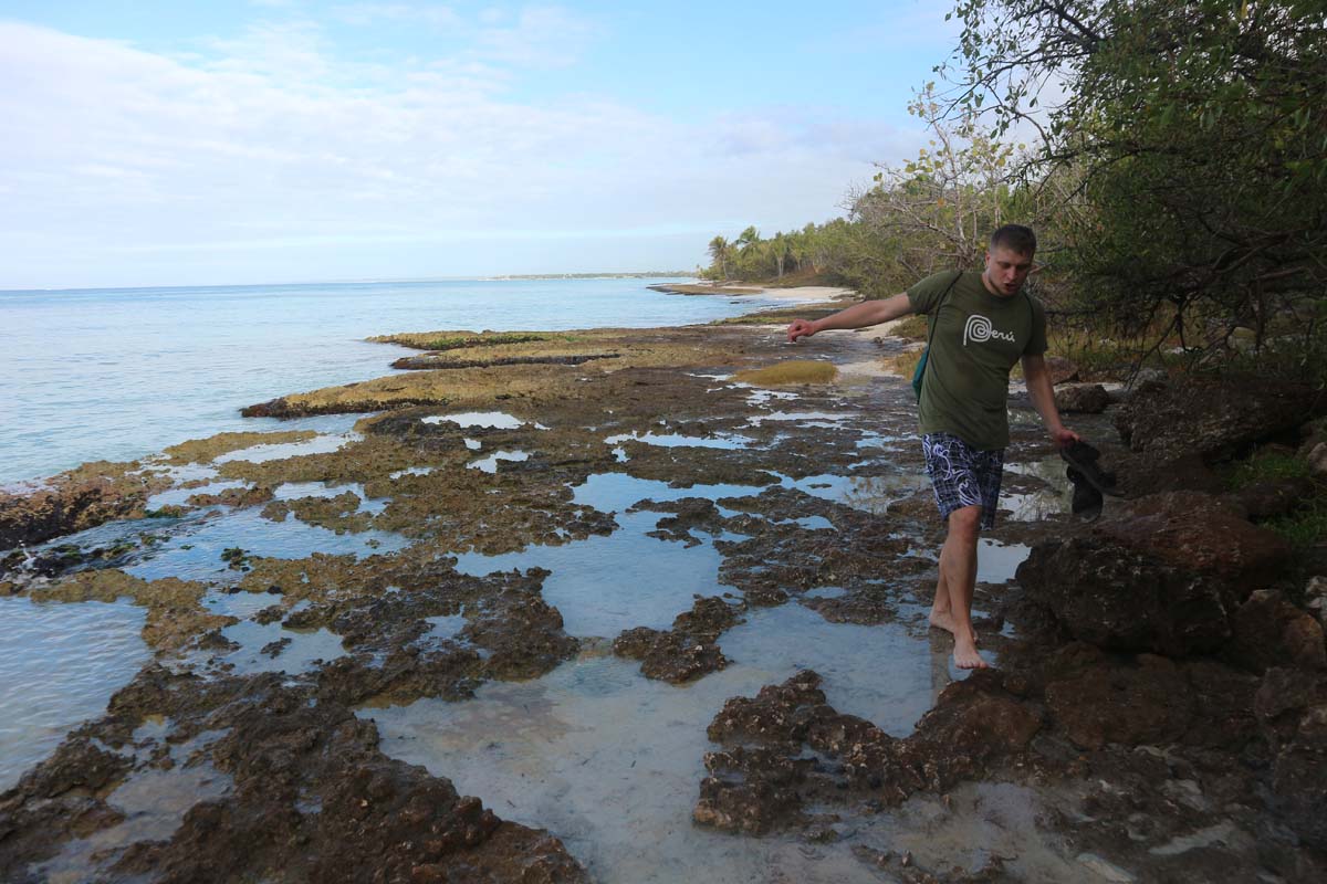 Ми з Дашею з’їли величезну порцію їжі з м’ясом і авокадо за 150 песо (3$) на двох. Поїздка тривала близько шести годин, за цей час ми змінили 5 видів транспорту, від розкішних автобусів, до повільних маршруток, що розвалюються. Ми оселилися в селищі Лас Галерас. До заходу сонця було лише кілька годин. Так, що колись повечеряємо, а зараз треба було бігти гуляти поки ще світло. Якщо не знаєш куди йти — рухайся до печери. Ще вранці ми були на Карибському морі, тепер на Атлантичному океані. Картинка пляжів змінилася суттєво. Тепер це потужний і безкрайній океан, довжелезні хвилі десь далеко розбиваються об бар’єрні рифи. Серед океану невеликий острівець із пальмами. На пляжі іспанська табличка говорить “Не намагайтеся доплисти до острівця” Пальми розташовані вже не так густо. Дуже великий простір для повільних романтичних прогулянок. А зліва гори! Я вже переймався, що тут зовсім гір немає, а так, одразу додали собі у маршрут. До печери було кілька кілометрів прекрасною зеленою зоною, причому дорога пролягала через п’ятизірковий готель. Охоронець привітав нас), На жаль, пляж готелю був сильно занесений водоростями, але при цьому люди виглядали задоволеними відпочиваючи на території готелю. Ми взагалі не засмутилися, бо до готелю не прив’язані, а вже сто відсотків бачили, що є пляжі без водоростей у цій країні. Потім навігатор нас почав вести трохи по джунглях, головне встигнути назад проскочити це місце до темряви. Незабаром навігатор нас повів по скелях, причому досить небезпечним маршрутом. Ми акуратно переступали крок за кроком біля небезпечних урвищ. Напевно, наші мами не схвалили б цей маршрут.