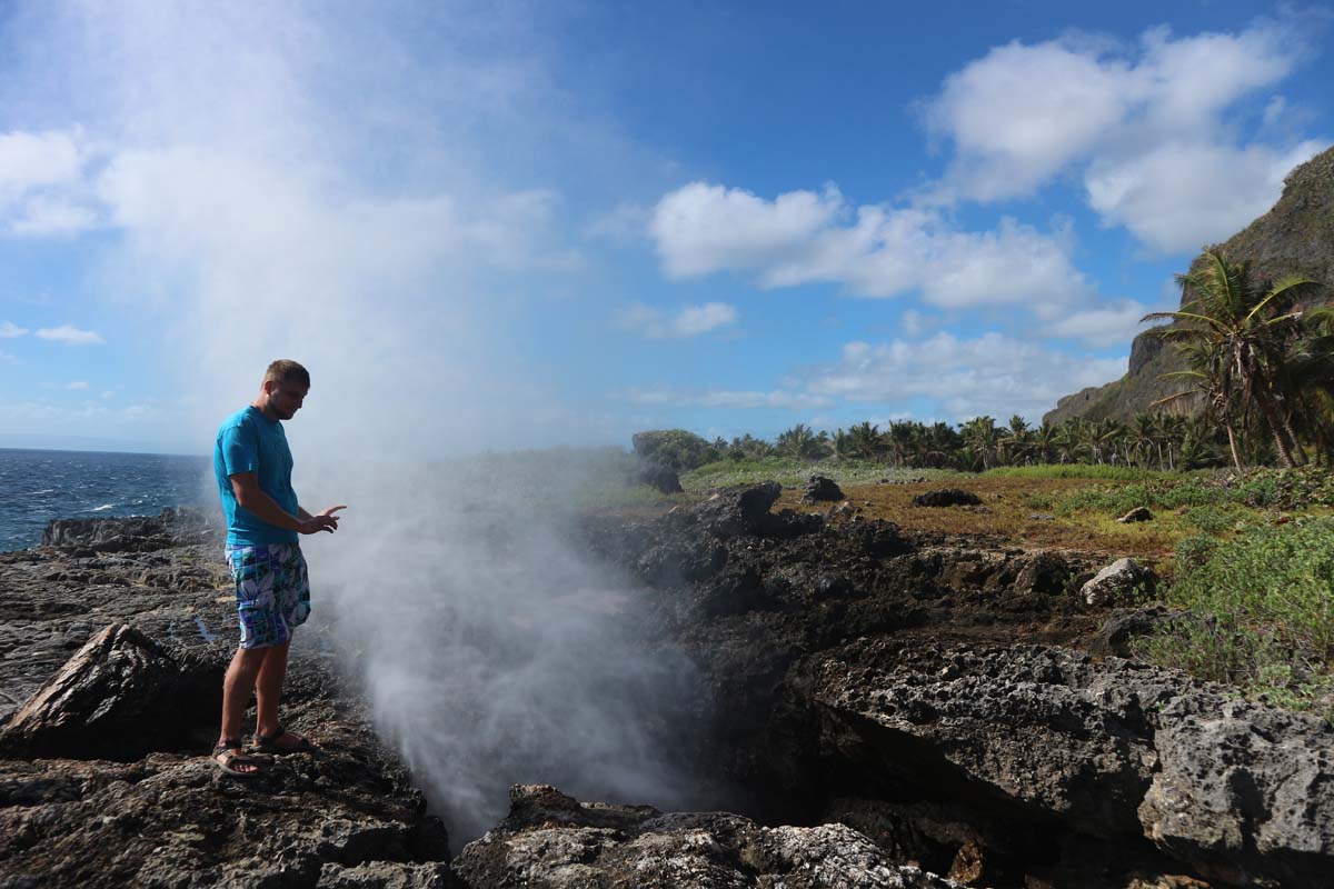 Зате по дорозі відкривалися чудові краєвиди на високі гори. Таксист привіз нас до пункту призначення – пащу Диявола. Перед нами була діра радіусом у пару метрів, з дірки приблизно кожні 30 – 40 секунд виривається потужний потік дрібних бризок. Висота пострілу досягає до 14 метрів, звук у момент виверження дуже сильний і справді страшний. Головне не підійти до діри з того боку, в яку вона вистрілює. За дірою близько 30 метрів застиглої та роз’їденої водою лави. Якщо підійти до краю, то внизу можна побачити всю потужність океану. Там справжнісінький шторм, гігантські непокірні хвилі розлітаються після потужних ударів об скелі. Море змінює свою геометрію під дуже небезпечними кутами, добре, що скелі досить високі. Хоча і тут бувають сюрпризи, в одну з таких вилазок удар об скелю був настільки сильний, що рівня води вистачило щоб мене залити.