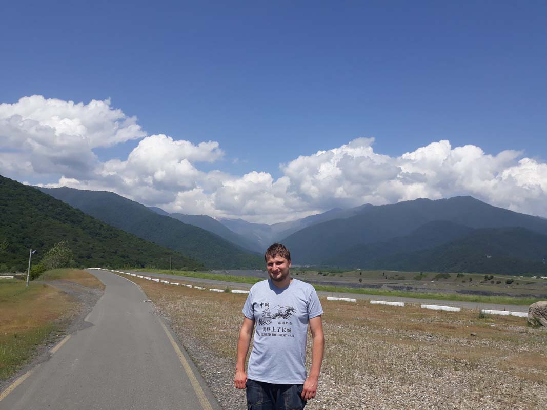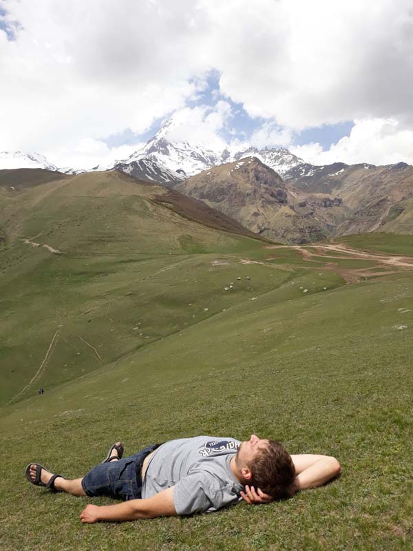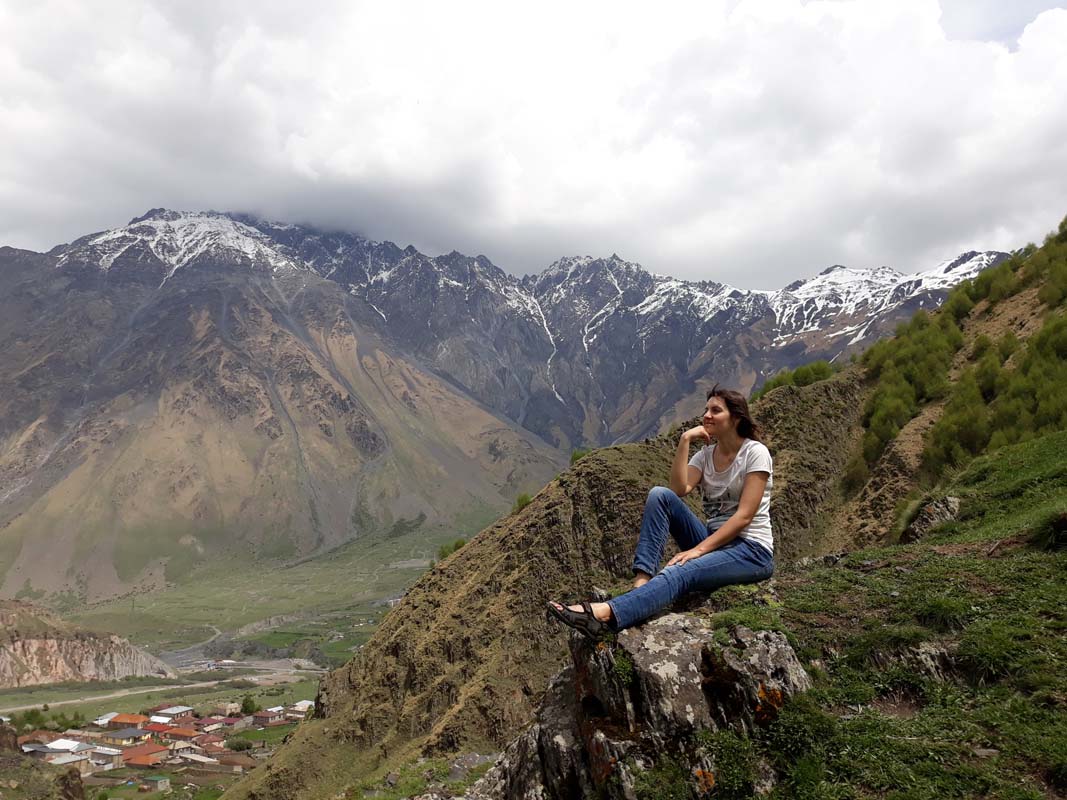 Водій явно поспішав. Трасою ми летіли на надзвуковій швидкості. За вікнами промайнула Мцхета. Як все легко у них. Аеропорт-готель-автовокзал-гори, всі наче чекають на зупинках поки ти підбіжиш і застрибнеш у маршрутку. Після години їзди водій зробив зупинку на 10 хвилин у мальовничому місці. Місцева бабуся відразу нагодувала нас величезної хачапурі за 5 ларі (2$). З сонячних та соковито-зелених гір лився водоспад. З іншого боку траси урвище. Перепочили і помчали в гори. За вікнами почав з’являтися сніг. Ми з Дашею трохи напружилися. У нас із собою лише літній одяг. Види, які часом відкривалися з маршрутки це додаткова екскурсія) На наше щастя Степанцмінда знаходилася трохи нижче за сніги, і погода виявилася затишною. Головною метою маршруту була Троїцька церква на горі. Ми її добре бачимо, але треба визначитися, як туди забратися. Навігатор вирішив нам показати, як це правильно зробити. Але, мабуть, правильно, якщо у вас з собою є вертоліт. Але після Китаю ми вірили в точність карт і не посміли засумніватися.
