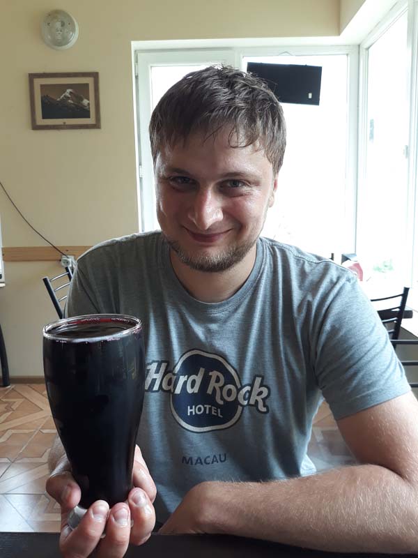 Спочатку карти нас відвели з головної дороги і повели тонкою вуличкою до якогось грузина прямо у двір. Доки ми йшли, двоє хлопців на нас з подивом дивилися. Ми здивовано дивилися на карту. Вони нас вирішили зупинити та відкоригувати. Дійшли до підніжжя гори. Дві дороги. Причому та, яку пропонує навігація, явно нелегка. Про іншу дорогу карта повідомляє, що там немає проходу. Ну Ок, дамо другий шанс картам. Підйом був якийсь особливо складний, здавалося, що можна буде ласти склеїти. Хоча здолали ми лише 5 метрів поки що. На щастя на зустріч спускалися інші жертви навігації. Вони нам і розповіли, що йти треба тією дорогою, що ліворуч, вона мальовничіша і легша. Дорога, яка нібито не стикується у нас у картах. Скільки ми не йшли, нас навігатор вмовляв повернутися на той маршрут що для туристів з вертольотом. Панорамні засніжені гори огортали нас з усіх боків. Дорога була значно легша за попередню. Деякі туристи навіть із дитячим візком піднімалися. Година у дорозі, та ми на місці. З церкви відкривалися справді чудові краєвиди. Тут гори мають дуже своєрідну палітру кольорів. Немов у горах осінь. Було близько 12-ї ранку, а ми вже виконали денний план. Було якось незвично. Ще тиждень тому у Китаї на огляд визначних пам’яток у межах міста міг піти цілий день щоб дістатися. А тут ми проїхали немалу частину країни і піднялися на гору. Нічого, зараз розширимо план. Тут десь є водоспади. Десь у сенсі у Грузії. Але спочатку обід! Спустилися і зайшли в дуже просту кав’ярню. “Хінкалі є?” Проте питання, як і про вино було досить риторичне. Хінкалі коштували 1 ларі за штучку (0,4 $) а холодне домашнє вино 5 (2$) ларі за келих…