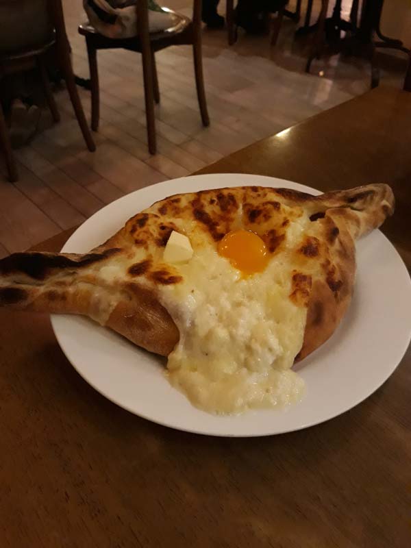 Офлайн карта на відмову не хотіла показувати нам ресторан. Потрібен був інтернет. У першому магазині мені його роздали з мобільного телефону. У Тбілісі дуже зручне та дешеве таксі. Якщо не знаєш як кудись дістатися найпростіше зловити таксі і доїхати. Водій спершу завіз нас у двори. Зрозумів, що помилився і привіз куди треба) З музикою в ресторані було досить дивно, вірніше її було мало. Але атмосферу поставив грузин, який наполягав, щоб ми пересіли до нього за стіл. А то сидимо окремо від усіх. О грузинська кухня. Як було смачно. Насправді у грузинських ресторанах Києва готують не гірше. Якщо ви ще не були в Грузії, але хочете в неї закохатися та полетіти, просто замовте в ресторані аджарське хачапурі.