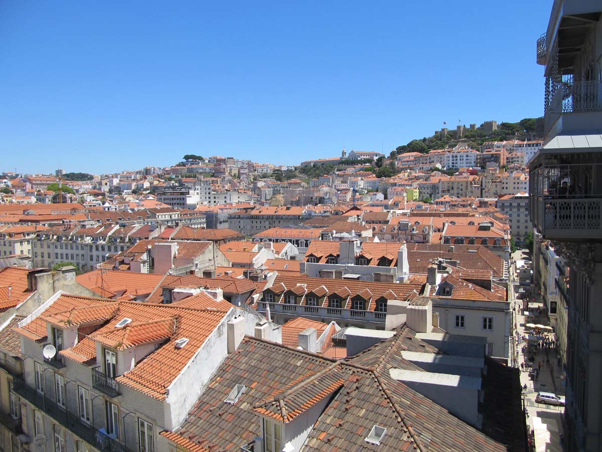 Розвага виявилася дивною. Стоїш у черзі хвилин 40 для того, щоб піднятися за 1,2 євро в ліфті на оглядовий майданчик, на якому все затягнуто товстою рабіцею, і потрібно платити ще 1,5 євро, щоб піднятися пішки на те місце, де немає рабіци. А за фактом до цієї оглядки можна дійти пішки з площі Largo do Carmo, що знаходиться з нею на одному рівні. Якось старт у Лісабоні не вдався.
