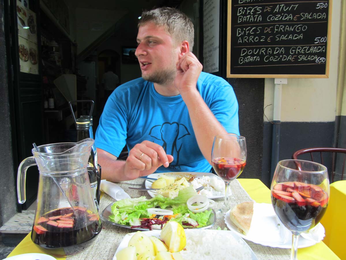 Але трапеза все вирішує, адже від кухні в країні залежить багато. У першому ресторані нікого не було, і ми також його змушені були покинути. З персоналу ніхто не ризикнув підійти до англомовного туриста, а коли дівчина таки підійшла, то на спробу щось замовити нагородила нас щедрим мовчанням і усмішкою на всі 32. Вона навіть намагалася олівцем відзначити що входить у їх спешл меню, але потім збилася, спробувала витерти олівець, ще більше все заплутала у португальському меню, посміхнулася нам на 33 і на цьому наша коротка трапеза закінчилася. У ресторані, що стоїть поруч, люди були, але в такій кількості, що нам запропонували підсісти до якоїсь бабусі, яка зляканим виглядом глянула на нас. А ось із третім рестораном поперло так, що рейтинг Португалії різко зріс.