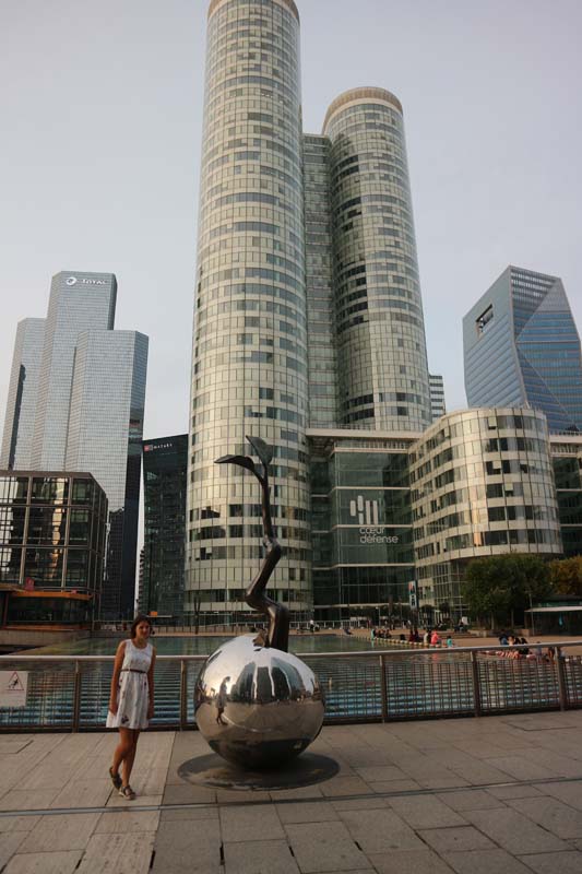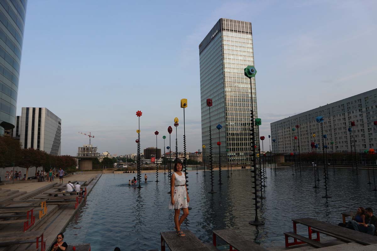Спочатку ми їхали наземною гілкою метро прямо поряд з Ейфелевою вежею. Мені здається, до планування маршруту обов’язково потрібно включати цей проїзд. Прямо як екскурсія виходить. Незабаром ми доїхали на околицю міста у відносно новий район. Це був неначе шматок Сінгапуру чи Гонконгу на околиці Парижа. Висотки немов змагалися між собою своєю незвичністю та красою. Уздовж висоток довгий піший променад із басейнами, фонтанами та рослинами.