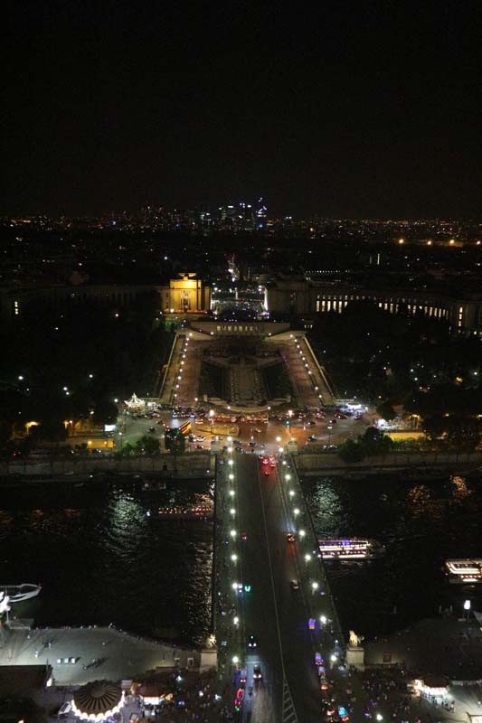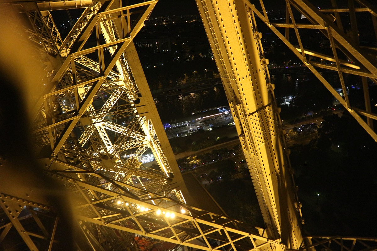 Радісно проїхалися на метро вздовж вежі. Тепер за планом була остання точка маршруту – повалятися на Марсовому полі, милуючись красою творіння Ейфеля. Але, як на зло, черга на піший підйом була відсутня. Хоч сили нас покинули ще години 3 тому, побачивши нічну Ейфелеву вежу енергія з’явилася немов із повітря. Пішки можна піднятися лише до другого із трьох рівнів. Коштує таке задоволення по 7 євро. Але на вежу не можна зі склом. А у нас якраз акційний келих. Тепер вибір став ребром. Пам’ятний сувенір чи враження. Перемогло друге. Але келих я придумав, куди можна заховати, щоб не знайшли. Поки ховав келих, то в моєму сховку хтось уже теж сховав келих. А взагалі, у мене була надія, що там виявиться заповітна пляшка з грошима з Орла і Решки.