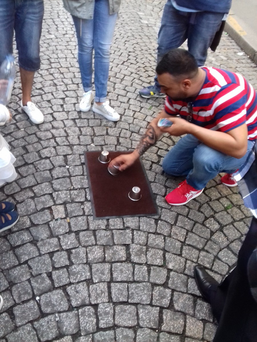 Якийсь час ми залипли, спостерігаючи як розводять лохів під час гри у “Наперстки”. Ну там, де треба вгадати під яким стаканчиком м’ячик. Провівши аналіз, ми визначили близько 6 підставних осіб. Кожен мав свою роль. Був підставний лох, який завжди не вгадував, вказуючи на свідомо неправильну склянку. Був чоловік, який завжди вигравав. Був хлопець, який показував лоху як треба грати. Були інші персонажі. Раз на пару хвилин траплявся якийсь справжній лох і шоу починалося. За нашими підрахунками за 10 хвилин команда акторів підняла близько 300 євро. Але таке шоу довго дивитися не рекомендується, оскільки кишенькові злодії можуть обчистити навіть простих спостерігачів.