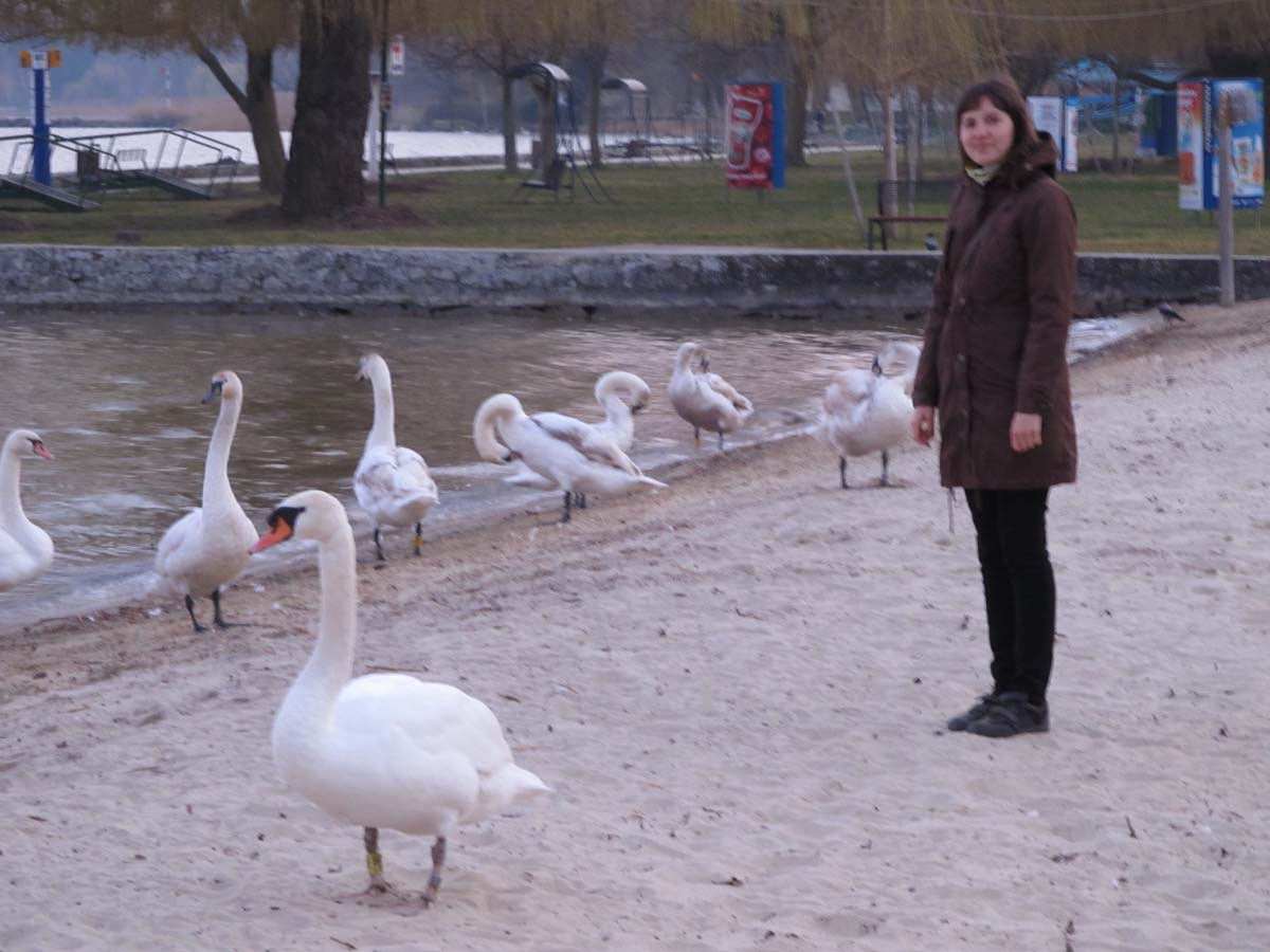 Але ввечері прогулятися звичайно приємно. На одному з берегів гуляла зграя лебедів, коли Даша пішла фотографуватися, лебідь-ватажок натякнув, що збирається нам відповісти, тому довелося цю компанію покинути. Оскільки у місті ніхто не шпрехає англійською, та ще й дуже пізній час – 18:00, то все довкола закрито і на вулицях немає людей. Поїсти тут стало цілою проблемою.