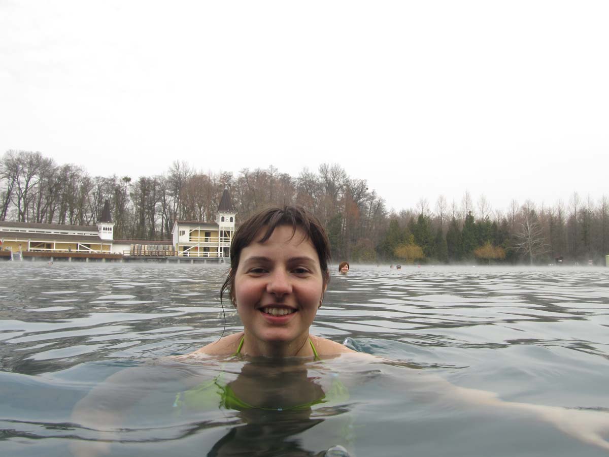 Коли Даша складала маршрут, цей день на секунду видався якимсь потенційно нездоланним – 4 міста. Але згадавши наш американський маршрут, ми навіть не парилися, що тут є якийсь ризик. Оскільки до Хевізу ми приїхали вже зовсім глибокої ночі для Угорщини, то о 20:00 ми могли розраховувати лише на мівіну по 16 грн із єдиного працюючого маркета, що працює аж до 22:00. Мета всього цього ланцюжка міст була термальне озеро. Коли ранком прокинулися, погода була похмурою, на вулиці було 9 градусів тепла. Я сказав «Не знаю, що має статися на озері, щоб перекрити весь цей складний маршрут та проблеми із харчуванням». Я припустив, що хіба що наявність русалок зможе все виправити. Ще і вхід, порядку по 20$ з особи. Переодягнувшись ми вийшли на терасу, з якої спускалися сходи в озеро. Почавши заходити у воду, вода здалася мені не дуже теплою, але дубар на вулиці просто заштовхнув мене у воду. На 9 градусній похмурій вулиці, під обдуванням холодного вітру, особливо в плавках не встоїш. Тіло до води звикло за секунди, а висуватися зовсім не хотілося, тому що при найменшому піднятті мокрої руки за межі води відчувався сильний мороз холодного вітру. Через кілька хвилин озеро вже здавалося теплим, а над водою піднімалася пара. Пливучи в цьому пару відчуваєш якесь дивне ейфоричне почуття. Начебто, на перший погляд, нічого особливого, але як воно заворожує. А найприємніше, що це холодна частина термального озера. Пропливши крізь двері до приміщення, ми потрапили в теплу частину, обрамлену плиткою. Тілом пішов релакс. У теплій воді було приємно-розморливо. Але і це ще не все, далі на нас чекала гаряча частина озера. До гарячого басейну навіть зайти було трохи важко. У гарячій воді розморило на повну. Також у воді треба зайняти чергу і з кожним дзвоном дзвіночка просуватися на одну людину вперед. Попереду нас чекали гідромасажики, при кожному пересуванні вперед масажувалися різні частини тіла. Почувши наш план подорожі термальними джерелами країни, хлопці з пітера люб’язно запропонували притримати для нас місце, поки не пересунеться до початку масажів. Оскільки у них на це озеро 10 днів, а в нас 3 години і треба починати рух до іншої частини країни в термальні печери. За цей час ми смачно перекусили у турецькому ресторані, на території комплексу. Під час масажу в гарячій воді, всі невимушено спілкуються на актуальні теми про температуру води, про лілії, що процвітають, про інші термальні джерела. Бабуся з оркостану побажала нам вдалого маршруту. Треба було рухатися далі. Три години плюхання у воді пролетіли непомітно. Насамкінець ми ще раз зробили коло від холодного до гарячого. Загалом місто Хевіз отримує залік, озеро справило сильне враження. Наступні купальні у нас було заплановано у готелі Геллерт, міста Будапешт.