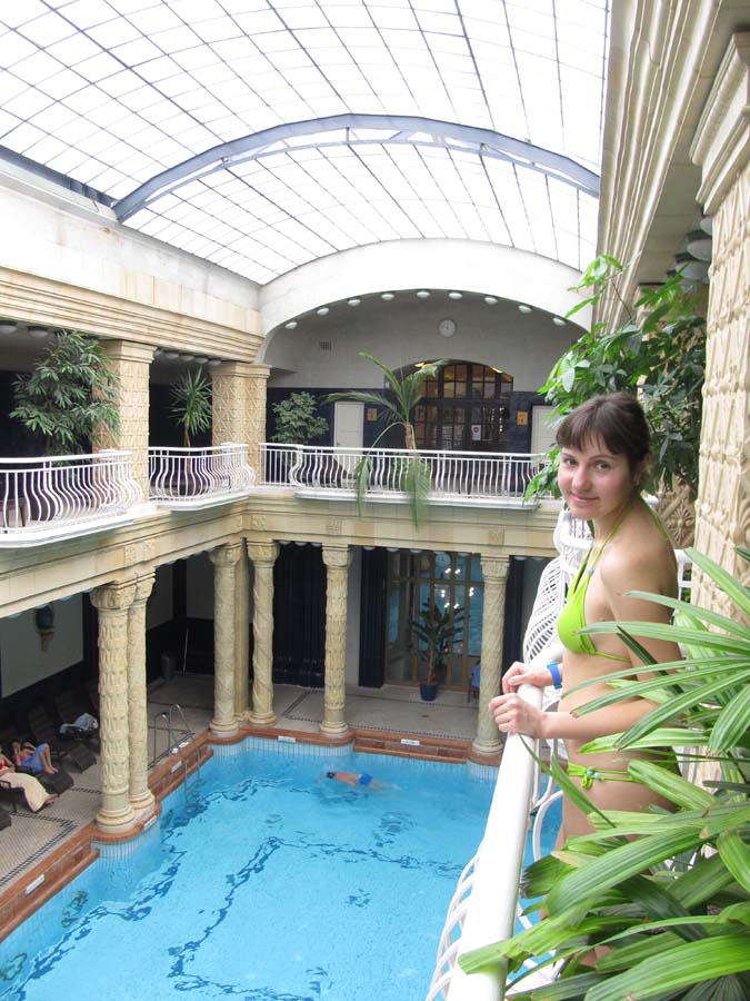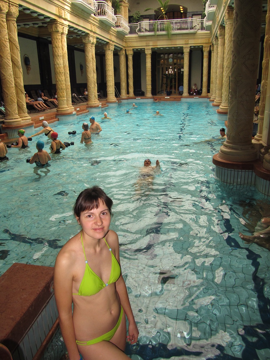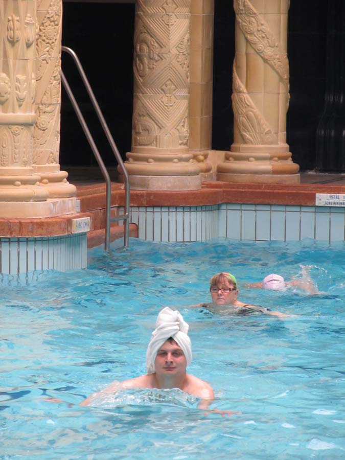 Нарешті один чоловік все ж таки зрозумів нас і показав на трамвай і назву потрібної зупинки на табличці і навіть сказав, що нам треба потім буде «Цвай». Хороша новина була в тому, що за 20 хвилин ми таки змогли з’ясувати маршрут. Погана ж новина була в тому, що із зупинкою чоловік помилився. Загалом після приїзду на зупинку у нас ще випав шанс прогулятися вуличками міста. Місто до речі виявилося красивіше Будапешта, так, що ми жодного разу не пошкодували. Потім ми чекали на цей Цвай хвилин 20 і ще хвилин 30 їхали на ньому. По приїзду, намагалися з’ясувати де купальня у корінних жителів. На щастя по рушнику з пакету, що стирчить, вони швидко зрозуміли і вказали куди нам йти. Отже, ми вже близько до цілі, перекусивши дорогою в парку ми пішли в печерні купальні. Вони були не настільки термальними як усі попередні, зате красиві.