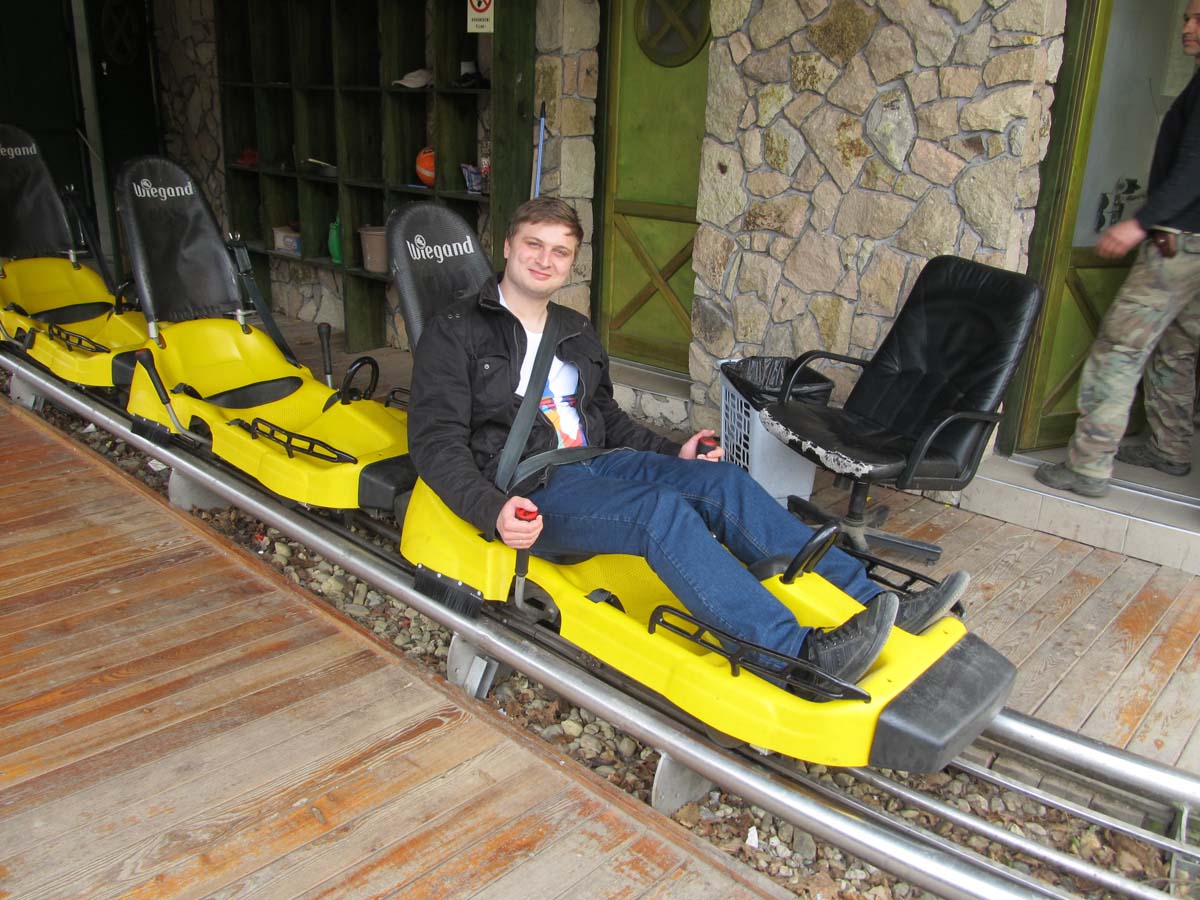 Для керування є лише ручка гальма. Хм … Їхати в гору кілька хвилин, поки нічого не відбувається. Збоку табличка із попередженням, що на верху вже самостійно все. Доїхала машинка до верху, і трос відпустився. Боб полетів кулею вниз по віражах, швидкість почала рости настільки швидко, що вітром почало обличчя трохи приминати. У потоці адреналіну я хапаю гальмо, працює, але з гальмом не так цікаво. Відпускаю гальмо, швидкість, напевно, кілометрів 70-80 плюс маса тіла, від несподіваної швидкості просто жах нахлинає, реально страх вилетіти. Долетів я до низу, чую десь далеко Дашин крик, через хвилину прилетіла Даша, перша її фраза «Ще?» відповідь «Звичайно!». На друге коло я зібрав усю мужність у кулак і вирішив пролетіти взагалі не гальмуючи. Давно я такого страху екстриму не відчував. Сумарна швидкість була така, що бобслей підкидало і на поворотах утримувався лише завдяки ременю. Тіло не було готове до такого навантаження, після прильоту трохи навіть заколисало.