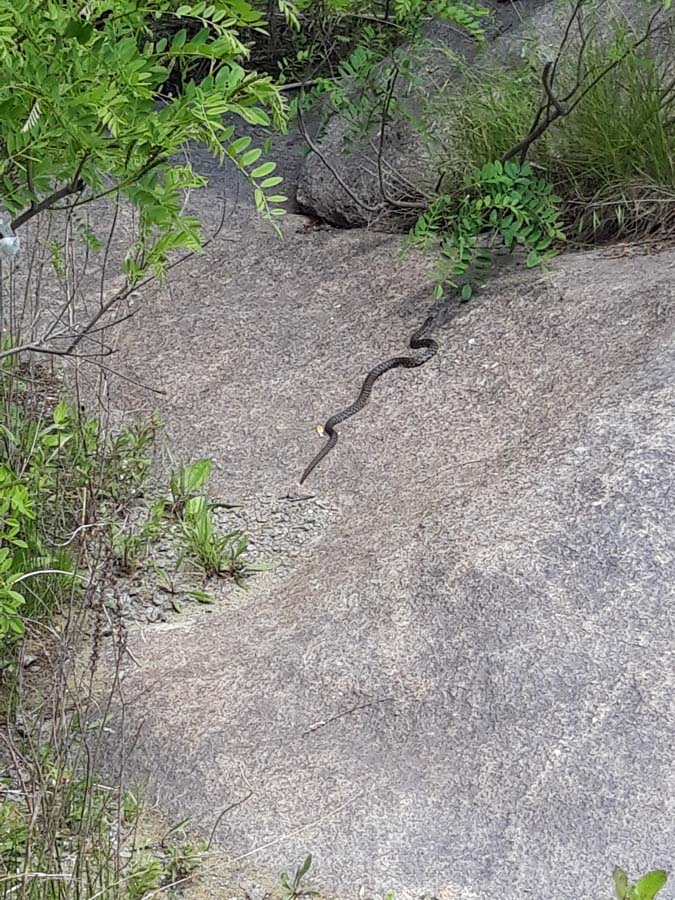 Я на тому камені опинився зі швидкістю світла, змія ж почала шипіти і незадоволена повзати. Під час подальших зустрічей зі зміями я кричав все менше і менше, під кінець поїздки вже був випадок, коли ми сиділи в Дніпрі на березі, і на зустріч пливла змія, яка хотіла виповзти поряд з нами, я просто помахав їй рукою, щоб вона пливла далі у своїх справах. Але чим прекрасні маршрути Хортиці, що вивчиш всю флору і фауну, уважно дивлячись під ноги на наявність змій.