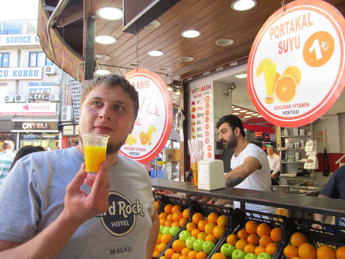 Далі ми пішли до порту Кабаташ, щоб вирушити в азіатську частину. Але на який саме порт нам треба я не пам’ятав, але Даша здогадалася знайти торішні фотки на планшеті і показати їх в тікет-офісі. Чоловік по фотографіях не міг зрозуміти де це, але під наближенням почав розглядати написи на магазинах і визначив, що це район Ускюдар, оскільки у назві однієї з магазинів фігурувала назва району. Ще пощастило, що наш кораблик вирушав за хвилину. В Ускюдар ми пішли на ринок, де продають фреші по лірі (0,33 $). Напилися апельсинових фрешів, пішли в магазинчик, де щороку Даша купує собі піжамні штани, повернулися ще раз на фреші.
