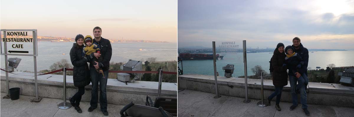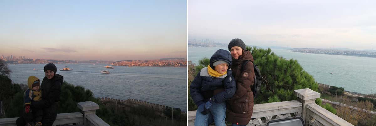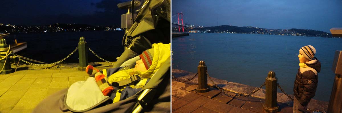 Раніше правда було освітлення жовтішим, що додавало магії в атмосферу, але мечеть і міст як завжди прекрасні. Так само в цьому районі ми відвідали пам’ятне місце, де колись втратили рукавичку і по фотографії відслідковували точне місце її втрати. У старе місто поверталися транспортом, Мишко відключився одразу, як ми тільки увійшли в автобус. Коли треба було вийти і пересісти на трамвай, Мишко різко підбадьорився і оперативно виклав нам схему перетинів гілок трамваїв Стамбула. Ось вони знання! Хоч серед ночі розбуди дитину, розкаже все, що знає про транспорт Стамбула. Перед вечерею ми повернулися до парку Гюльхане, подивитися на сяюче місто з набережною. Жаль тільки, що зимовий вітер не дає довго стояти біля води. У нас було в планах відвідати та сфотографуватися в одному з ресторанів, де ми з Мишком 6 років тому сиділи, проте ресторани на центральних вулицях підняли ціни до непристойності. Боюся, що з такими цінами їжа може грудкою в горлі застрягти. Зате якщо вийти на паралельну вулицю, то цінова політика різко змінюється і до того ж у вигляді компліменту приносять свіжоспечений турецький хліб, такий весь надутий, і безкоштовний чай, і навіть ніякого додаткового сервісного збору, і рахунок на трьох просто казка 49 лір (9,2$). Усі наші посиденьки у недорогих ресторанах я відзначив на карті зірочками, і наприкінці оповідання є їхні координати. Вже після першого дня було зрозуміло, що Мишко успішно пройшов тест на піші маршрути))))