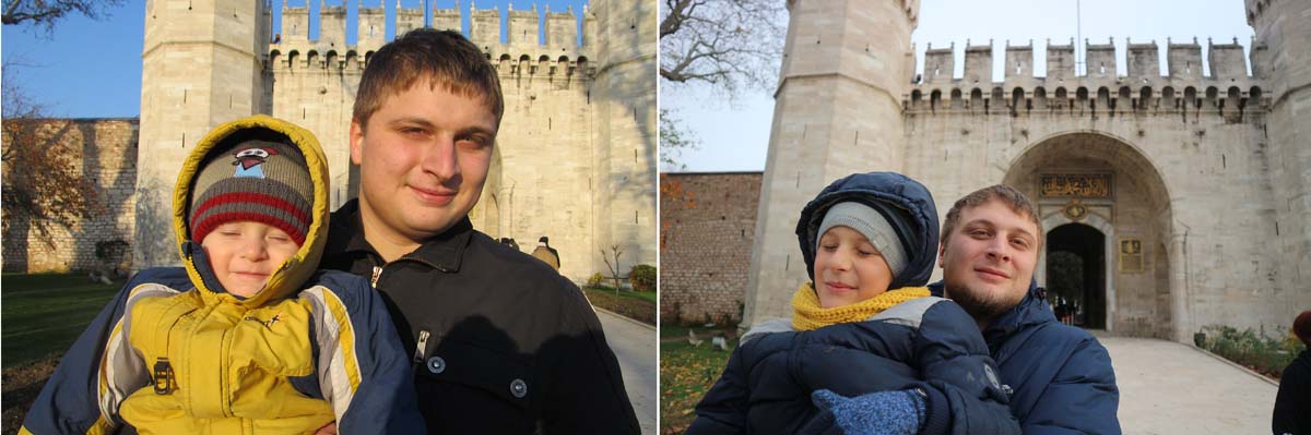 Ми хотіли почати його з Цистерни-Базиліки, але там спустили воду і, схоже, наповнять нескоро, йде реставрація. А відвідувати водосховище без води, це як весілля без музики))) Ну і гаразд, у Топкапи ми теж давно не були. Головне проскочити до появи натовпу. Наш вибір схвалила навіть погода, заливши всі галявини та будівлі сонячним світлом. Михайло зажадав, щоб Даша йому перечитала всі таблички у всіх визначних пам’яток султанського палацу. Але номер однієї з табличок 410 мене збентежив, довелося обмежитися приблизно десятьма табличками. Ще була важлива місія повторити фотографії у тих самих місцях та позах. Завдання виявилося не найлегшим, то відра для сміття вже немає на тому місці, то сонце не світить, то руки криві, ще й пропорції сторін камери відрізняються. Але ми справлялися як могли. Цікаво, що папуги облюбували саме парк Гюльхане та прилеглий палац, у простіших парках, мабуть, не годиться їм літати.