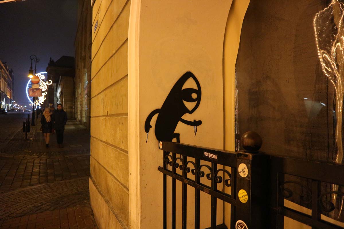 За кілька хвилин до нас дійшло, що це і була дуже вдала картина на торці будівлі – мурал. Картина зображала те, як це місце виглядало раніше. Загалом у Познані варто звертати увагу на дворики. Поки ми йшли до центру, місто стежило за нами. Причому стежило у буквальному значенні цього слова. Часом у найнесподіваніших місцях можна було побачити образи живих істот з одним великим оком. По всьому місту вони були десятками.