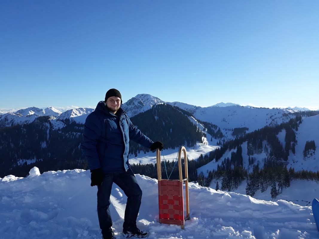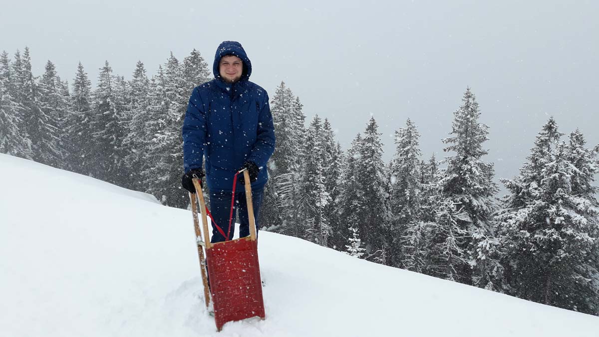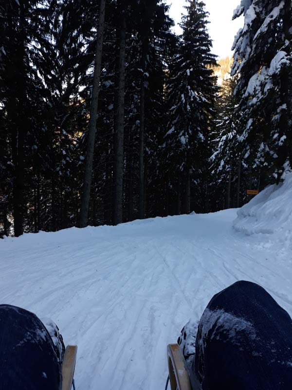 А тим часом я стояв біля старту траси. Жінка, яка продавала мені квитки, звернула увагу на моє взуття і сказала, що мені треба буде часто гальмувати п’ятами. Ще в інструкції була картинка, в якій санки треба тягнути на себе для екстреного гальмування. Ну почнемо! Сів відштовхнувся, їду. Аж не віриться, я їду! Так, спробую пригальмувати. Ага, якось не особливо гальмується. Їду швидше. Санки починають ще швидше їхати. Перший поворот, керованість хороша. На швидкості легко повернув. Їду ще швидше, чомусь їду дуже швидко. У вухах здіймається шум вітру. Починає продувати у всі щілини в куртці. Тепер зрозуміло, навіщо ті ґудзички потрібні. Щось їду я дуже швидко треба зменшувати швидкість, висять таблички про скидання швидкості. Почав гальмувати так, що за ногами залишався глибокий слід, нібито виходить. Але швидкість якась небезпечна на вигляд. Спуск став ще крутішим, втім, як і повороти. Вже дуже швидко їду, прямо лечу, лечу в прямому значенні цього слова, санки летять поруч. Тілом пішов потік адреналіну, летимо ми з санками перпендикулярно до траси. Зараз я відчую альпійські гори. Мене перекинуло, і я не тепер знаю не лише всю красу Альп, а й смак! На шоколадку “Мілка” взагалі не схоже. Сніг в Альпах якісний, без смакових добавок, свіжий, сьогоднішній. Від чола до ніг я був покритий рівномірним білим шаром. Санки лежали поруч, тому що я додумався накинути петлю на руку, щоб вони без мене не поїхали. Підвівся, намацав телефон, який у кишені був щільно законсервований снігом. Сніг виявився досить мокрим і довелося розстібати куртку, щоб відтерти телефон. Картки в джинсах спіткала та сама доля. Треба було перекласти все до кишень і відтертися від снігу. Кінчики пальців на морозі втратили чутливість, обличчя нило від холоду. Перезастібнув всі ґудзички і сховав все у внутрішні кишені, після цього я продовжив маршрут. Тепер почав відчуватись холодний вітер, а під попу забивався сніг, який доводилося на ходу відчищати. Далі спуск був із помірнішою швидкістю і навіть із зупинками. Я перетнувся з хлопцями, у яких уточнив чи ще довго. Мені сказали, що ще довго. Це справді був лише початок траси.