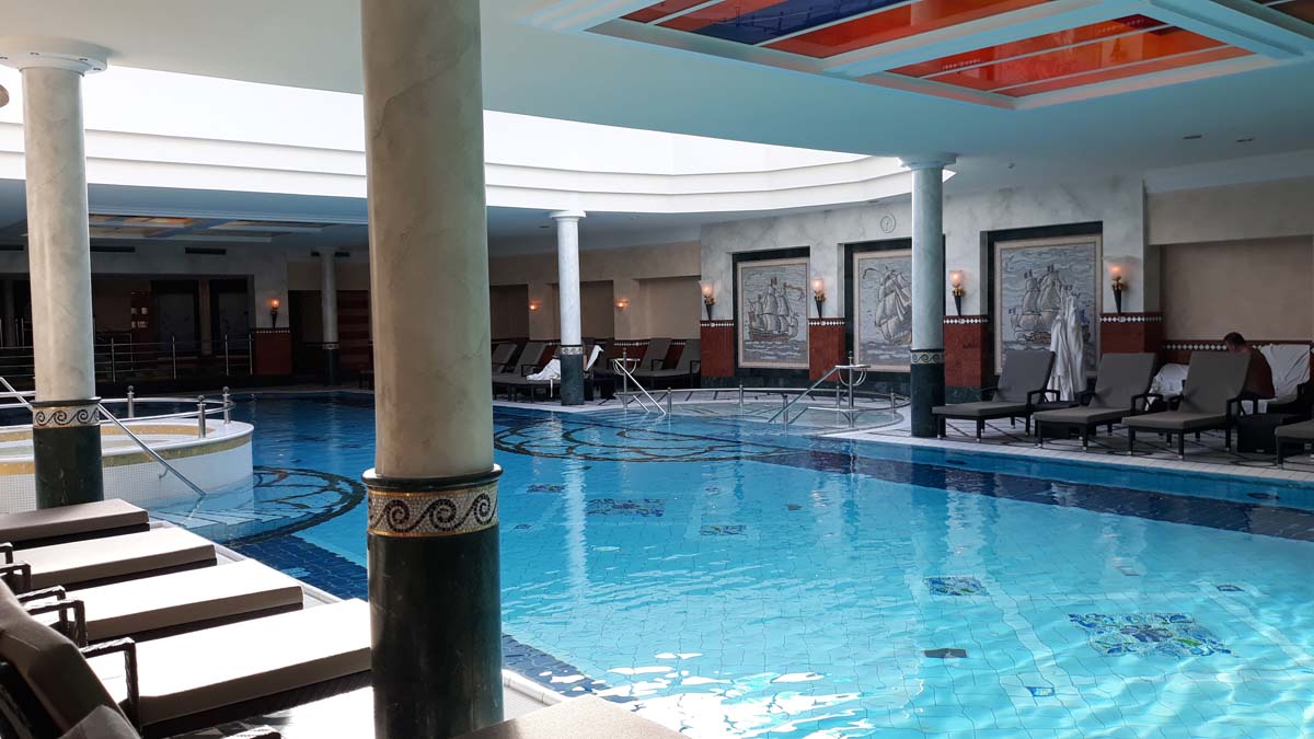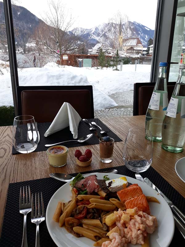 Халат, капці, все як потрібно. На нижньому поверсі на мене чекав шикарний басейн із зоною джакузі. Окремо Джакузі з гарячою водою, 4 сауни включаючи азіатську, релакс-зону з темними мармуровими сидіннями і релакс-басейн з теплою водою, де можна було лягти на спину наполовину зануривши голову і знаходиться в напівневагомості під лампочками у вигляді зірок. Ще щогодини приходить банщик і влаштовує шоу в саунах. З усіх саун мені сподобалася волога в азіатському стилі, що заповнена непрохідною на вигляд гарячою парою. Як я люблю цей запах. Після моїх вертушок-покатушок на саночках спа-зона готелю мені була якраз. Нескінченна радість та відвисання щелепи, якось так можна описати мої емоції. Але треба було вибиратися назад у номер, адже через 20 хвилин буде грандіозна італійська вечеря. Кухарі стояли вздовж піддонів з їжею та вітали гостей, що входять до зали. У нас було затишне місце з видом на гори та озеро.