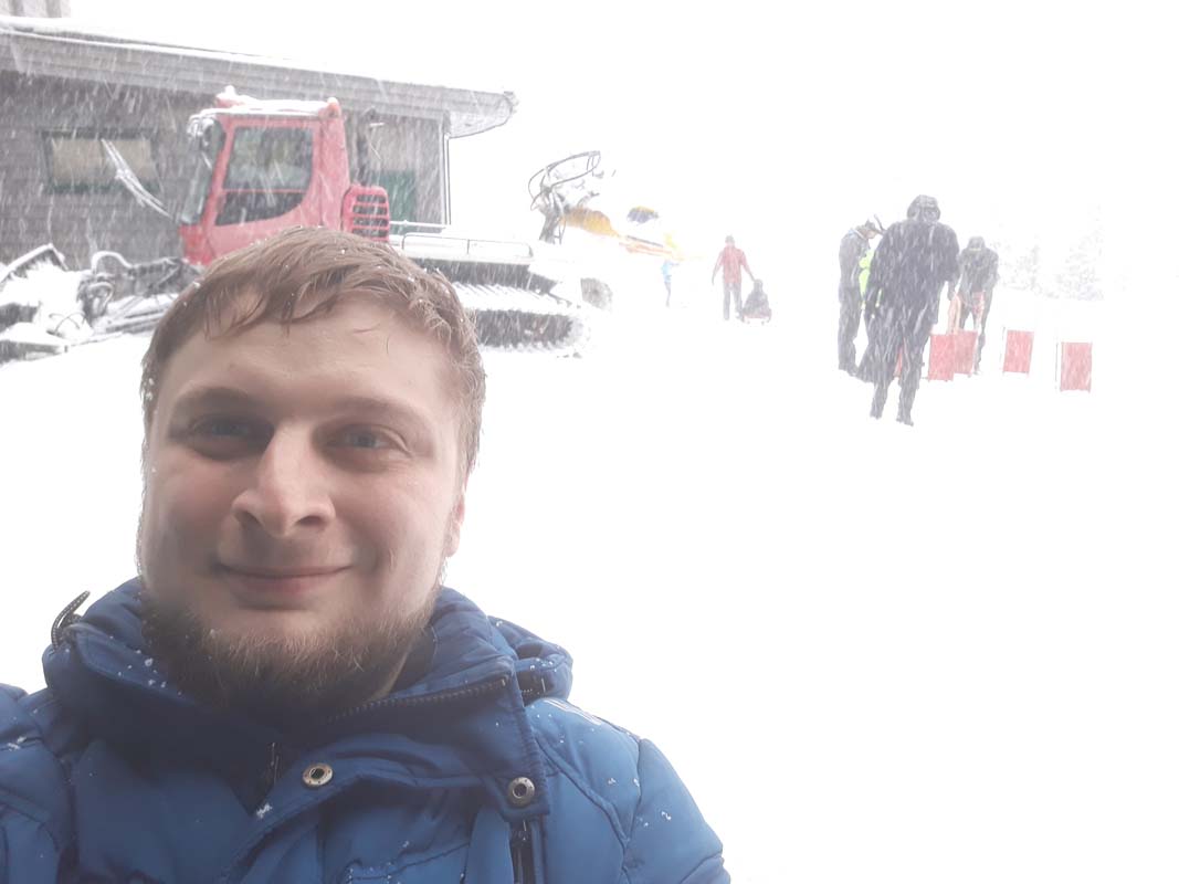 “Андрюша ти сильний, ти можеш, треба просто відірватися від ліжка, виспишся в Єгипті роки через півтора” – говорив я собі. Хоча кого я обманюю, в Єгипті я потім обіцяю собі виспатися в Києві. Ще й штори, що імітують абсолютну темряву. Ща перевіримо, чи зміг ще хтось прокинутися. Увімкнув вайбер, тут же упіймав повідомлення від Дениса, “Ну, що йдемо?! Щоправда, там дощ!”. Нам навіть горизонтальна крижана злива в Норвегії не була проблемою долати складні маршрути. Ще прокинулося близько чотирьох колег, та їх зупинив дощ. Поснідав, узяв парасольку на ресепшені й уперед. Слово “дощ” було досить щадне. Я навіть не міг зрозуміти, як ми спускатимемося під цією напівзливою. Але тут достатньо застосувати логіку. Я в будь-якому випадку прокинувся і лягти спати, це просто марна трата безцінного часу подорожі. Якщо не спати, то в готелі робити все одно нічого. На СПА зону і так буде ще часу вдосталь. Просто гуляти під дощем, сенсу немає, тому що я вже облазив тут майже все. А от якщо піти на саночки, то на висоті 1600 метрів можлива мінусова температура та дощ заміниться снігом. Тобто в будь-якому разі спробою походу на саночки ти нічого не втрачаєш. Хвилин 45 зайняв наш маршрут до підйомника. Підйомники працюють, я із полегшенням видихнув, боявся, що все буде закрито. Жінка з незворушним обличчям продала квитки та запевнила, що злива не проблема. Але біля каси висів екран із трансляцією веб-камери з вершини та попередженням. Моя ставка виявилася правильною, на самій вершині була справжнісінька завірюха.