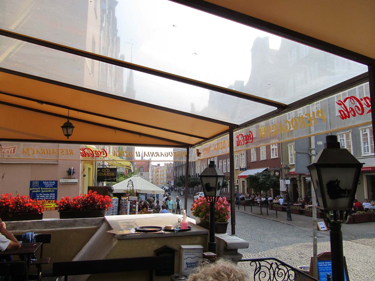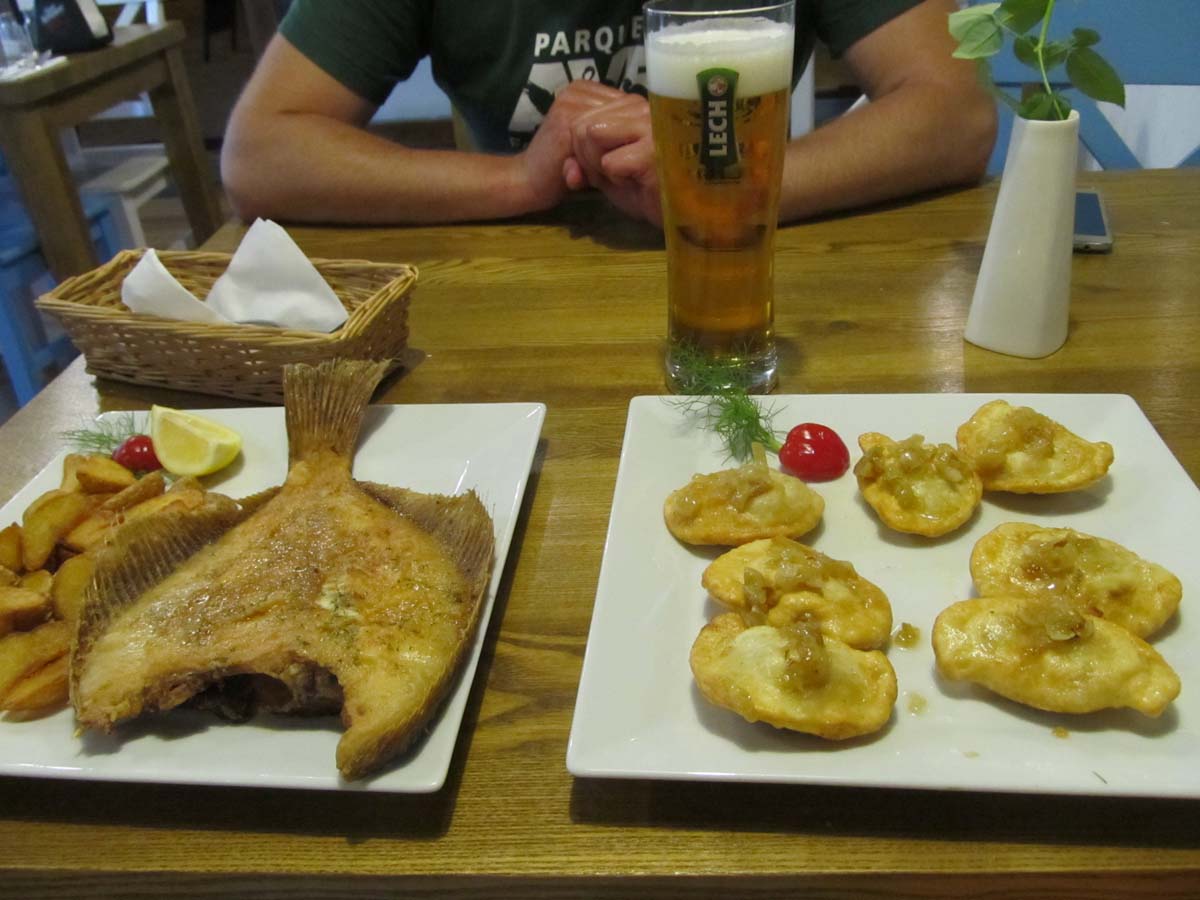 Вся краса в тих лісах та парках, якими пролягала велодоріжка. Зворотний маршрут, судячи з карти, був уздовж пляжу. Дорога була досить цікава. З води стирчали різної форми крани, на зустріч їхали велосипедисти на одному колесі жонглюючи кеглями. Іноді траплялися парочки на педальних автомобілях. Проїхавши пару кілометрів, ми вперлися у круті сходи. У хлопця уточнили, чи буде там дорога. Він з радістю хотів розповісти, як доїхати до Гдині, а коли дізнався, що нам до Гданська – здивовано посумнішав. Зверху виявилася стежка в якийсь ліс. Цей ліс виявився тим, яким ми гуляли пішки, з іншого боку. В основному довелося тягнути велосипеди нагору. Крізь дерева просвічували самотні промені вечірнього сонця. Незабаром буде темніти, а попереду ще один ліс треба проїхати. Як не дивно, але й у лісі нам GPS вказав куди рухатися. Вибралися ми у зовсім незнайомому місці. Планшет вказував нам їхати в невідомі нетрі. Або робити крутий об’їзд. Спочатку ми мчали містом з гори, з якої відкривалися чудові краєвиди на саме місто. Потім асфальтована дорога перетворилася на стежку, і ми знову в лісі мчимо вздовж паркану з колючим дротом. За парканом казарми. Куди нас вів навігатор, було відомо тільки йому самому. Але головне, що всюди виявлялася стежка. Судячи з кінця стежки у вигляді кількаметрового урвища, ті казарми зовсім не очікували на нашу присутність. Натомість ми виїхали чітко на міську трасу Гдиня-Гданськ. Але ліси нам були якось звичнішими, на найближчому повороті ми звернули в мережу парків. І мчали вже відомими нам дорогами. Весь наш маршрут зайняв десять годин, велосипеди треба було здати до 21:00. Здаючи велосипеди, ми поцікавилися у жінки, що вона порекомендує нам робити завтра. На наш подив у неї для нас був готовий маршрут на завтрашній день, правда не на велосипедах, а на трамваях та електричках. Також вона нам вирішила питання з нічним трансфером до аеропорту. Ще й гроші за взаємовигідним курсом у неї поміняли. На знак подяки можу хіба що порекомендувати її оренду велосипедів навпроти 48-го входу на пляж у районі Брзезно. Круто, люблю поїздки, де можна формувати маршрут походу справи. Шкода так не виходить із далекими поїздками. На вечерю хотілося якоїсь екзотики. До вареників із лососем ми замовили рибку Флаундера.