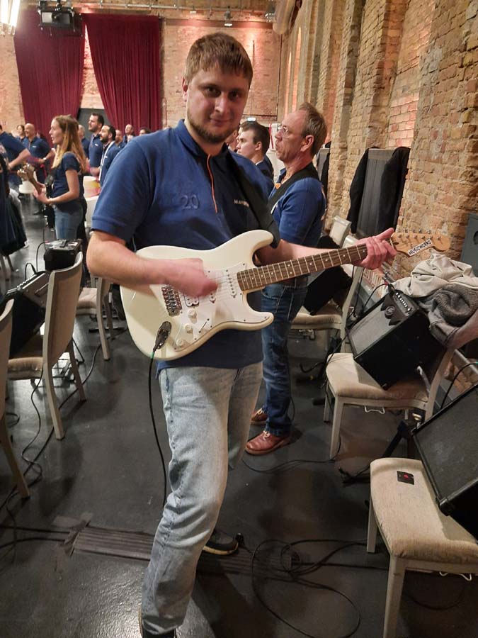 І тут я вже сам у ролі музиканта. Дві інші пісні я грав на електрогітарі. Гітара виявилася набагато складнішою за барабан. Але від гри на барабані, мабуть, була максимальна віддача. Навчання гри на електрогітарі ускладнювалося тим, що треба було зрозуміти нові для мене англійські терміни. Але я старався так, що навіть порвав струну. Це був не просто виступ, а справжня фантастика ще й у вигляді сюрпризу! І не важливо хто ти в офісі, топменеджер або рядовий програміст, тут ми всі музиканти і граємо пліч-о-пліч найкращий концерт у світі.