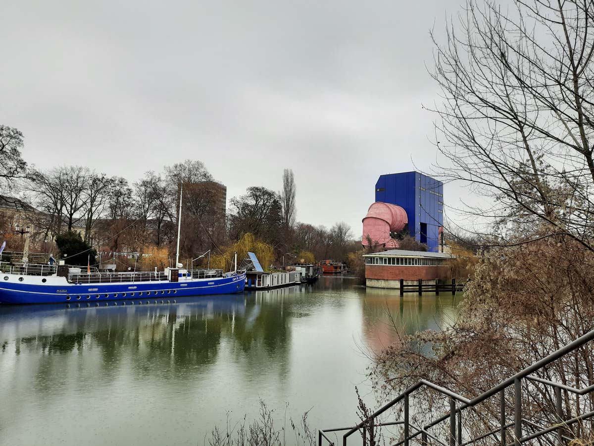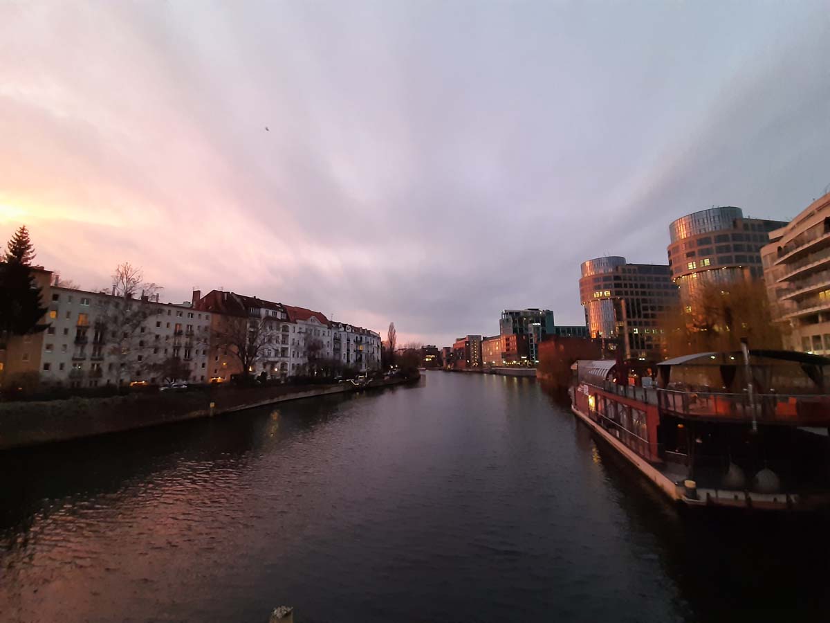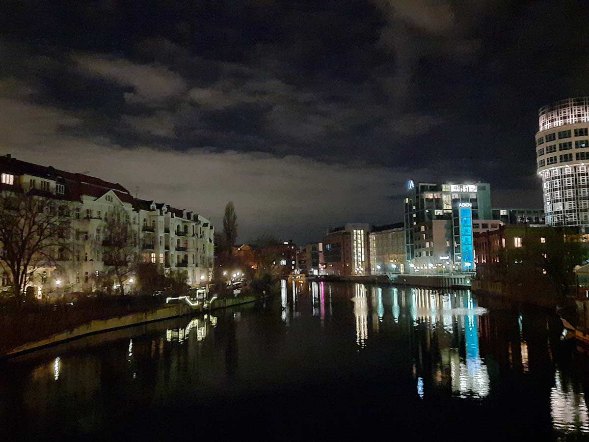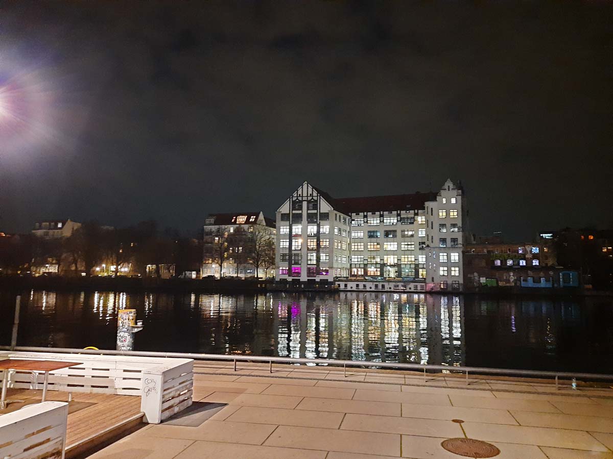 Потім відкрили безлімітний бар із коктейлями. Найцікавіше, що я замовив собі Куба Лібре, який ми постійно п’ємо в єгипетських готелях. Як тільки скуштував коктейль, аж запах солоного моря в носі відчув. Я буквально на мить провалився до Єгипту. Далі розпочалася дискотека, виступав то німецький гурт, то діджей. Я помітив цікаву тенденцію, що діджей збирав ширшу аудиторію, причому запалювали навіть співробітники та співробітниці поважного віку. У Німеччині вміють відпочивати! Зазвичай на гулянках надвечір виносять якийсь шашлик, який уже ні в кого не лізе. Німці пішли далі, приблизно о першій годині ночі, на рожні почали смажити смачну шаурму. Вона була настільки прекрасною, що співробітники відносили до номерів своїх колег, які пішли з корпоративу раніше. Близько другої години ночі я вирішив йти у свій номер, інакше мої ранкові плани прогулянки Берліном могли б не здійснитися. Потрібно було близько хвилини пройти вулицею між корпусами готелю. Надворі було тепло, навіть незважаючи на те, що я був у сорочці. Річка освітлювалася м’яким світлом нічних ліхтарів та прибережного готелю. Я, звичайно, вже стомився за день, але я не міг пропустити таку красу і вирішив зробити невелике коло вздовж каналу.