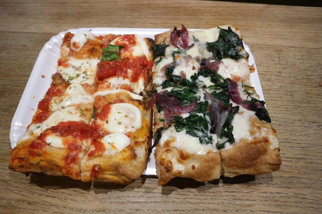 Тепер вечеря піцою і можна повертатися до Местре. Піцерію ми вибрали незвичайну, тут її готували на хрусткій фокачі. А на вітрині вона лежала в напівсирому вигляді, ти вказуєш який саме шматочок відправиться для приготування у печі. Ми настільки любо трапезували, що коли Аня написала що вже на вокзалі, то ми вияснили, що до потягу залишилось 29 хвилин, а нам йти пішки лише 28…