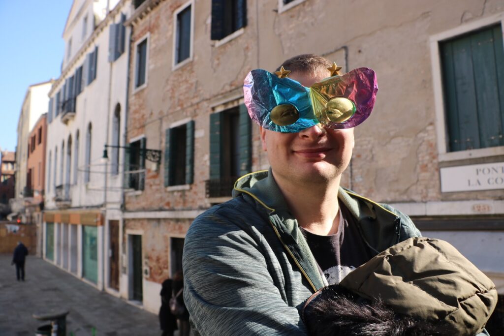 Канали то добре, але в нас ще був челендж “Знайти Маріо“. Маріо — це власник готелю з яким наші батьки потоваришували шість років тому і я хотів зробити сюрприз, записати відеопривітання мамі з татом, які зараз в Україні. Проблема полягала в тому, що готель давно закритий. Я запитував у сусідньому магазині працівників, вони нічого не знали про Маріо. Тож я написав йому емейла, а у відповідь вночі отримав що це не Маріо, а Вінченцо. Смішно, адже мама підтвердила що Маріо це власник готелю на Занзібарі, а в Венеції власника звали все-таки Вінченцо. Але це вже було по за нашим маршрутом, тож ідея провалилася. А поки що мандруємо по Венеції далі і тримаємо маршрут до центральної площі. Тим часом вуличками починають з’являтися перші люди у масках та костюмах.