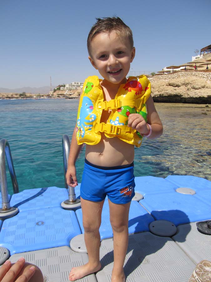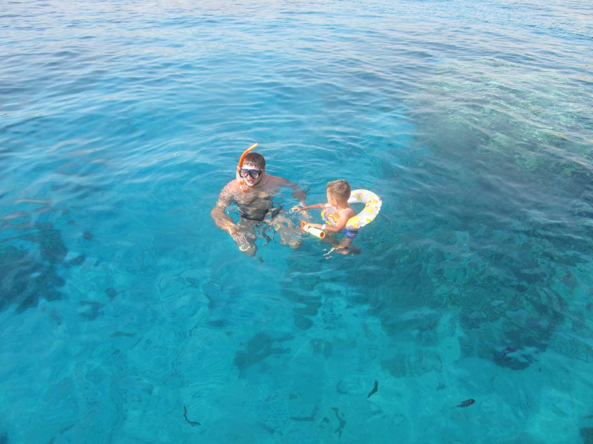 Номери були справді в хорошому тихому місці, а тещі взагалі дістався номер на чотирьох, ми його називали президентським, обидва номери були з видом на море. Зазвичай при заселенні є арабський трюк — не працює гаряча вода, ти дзвониш на ресепшен, приходить сантехнік, відкриває у підвалі кран і сподівається, що ти йому за це заплатиш. Я перевірив воду, вода є, хм… що не так. Стукаючи у двері, прибіг працівник і сказав, що полагодить нам кондиціонер, за його словами ми нібито зателефонували і сказали, що кондиціонер не працює. Зважаючи на все, наш арабський друг прибіг лагодити кондиціонер ще до того, як він «зламався». До речі, за годину до виселення з номера кондиціонер таки «зламався» в очікуванні заселення наступних гостей. Щодо всіх цих хитрощів, це звичайно мої особисті здогадки, але ми втретє в Єгипті, з них двічі була «проблема з гарячою водою» та один раз «із кондиціонером». Після сніданку на нас чекали два великі пляжі з багатим підводним світом. Людей у воді практично не було, незважаючи на температуру 34 градуси. Корал був великий і непоганий, але явно поступався коралу готелю Suconnect diamon beach (колишній Санрайз). Під водою нас чекали два скати, мурена, крилатки, хірурги, тридакни та купа іншої живності. Мишко з радісним настроєм заліз із понтона у воду на глибину, його одразу вкусила риба.