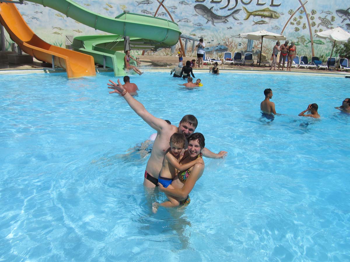 З 10:00 до 12:00 на території великого басейну відбувався повний треш в аквапарку. Зелена гірка, помаранчева, жовта, потім «Тато, а давай перевернемо того хлопчика з матраца у воду», потім знову зелена, потім «Тато, хлопчик знову заліз на матрац, пливемо перевертати!», потім м’яч, потім знову жовта. З сусіднього басейну долинали захоплені крики – було видно, як аніматори вчать кататися на серфі у басейні. У третьому басейні саме забивають якийсь переможний гол! Поки ми каталися з Мишком, дві дівчинки час від часу в мене стріляли з водяного пістолета і ховалися. Тут я дістав Мішину волину з сумки і в басейні пролунав крик жаху. Перестрілка доходила до того, що ми на великій швидкості летіли з водяної гірки і примудрялися перезаряджати пістолети, щоб під час польоту давати відстріл один одному.