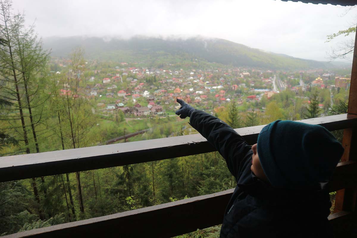 Пообідали вдома, з годинку поспали, що робимо далі? Звісно ж у гори! Мишу ця перспектива радувала не дуже, але він чудово знав, що за кожну взяту гору йому дістанеться морозиво! Тож часом Мишко навіть попереду біг. По маршруту ми проходили пам’ятні для нас місця, наприклад, он у тих кущах ми ховали коляску і продовжували маршрут з Мишком на руках. А ось у тому будинку ми просили залишити на час коляску, щоб продовжувати маршрут, а на цьому камені у нас обов’язкова фотка. Другий маршрут був не такий довгий, але на вершині гори на нас чекав краєвид на засніжені вершини “двотисячників”. По вершинах було видно, що похід на Говерлу зараз – задум небезпечний. Ризикувати не будемо, доведеться приїжджати ще раз серед літа. Потрібно знайти якусь альтернативу, але нижчу. Оксана порадила нам піднятися на Білу Кобилу. Погода сказала нам: – “Ви як хочете, а з 11:00 почнуться всі дощі, разом узяті за пропущені дні.” Проблема в тому, що вершина гори знаходиться від нашого готелю приблизно за 8 кілометрів і шанс того, що нас підбере транспорт вкрай малий, оскільки село практично порожнє, а маршрут йде практично по бездоріжжю.