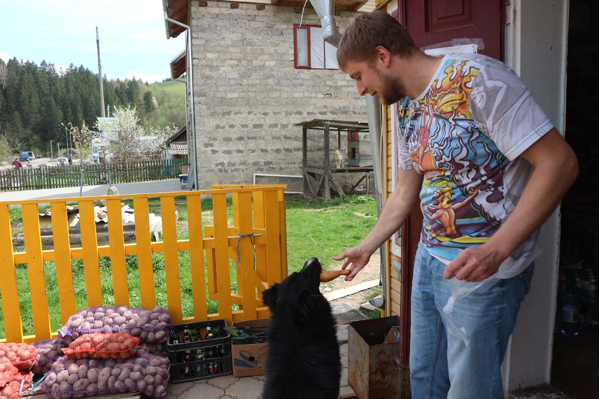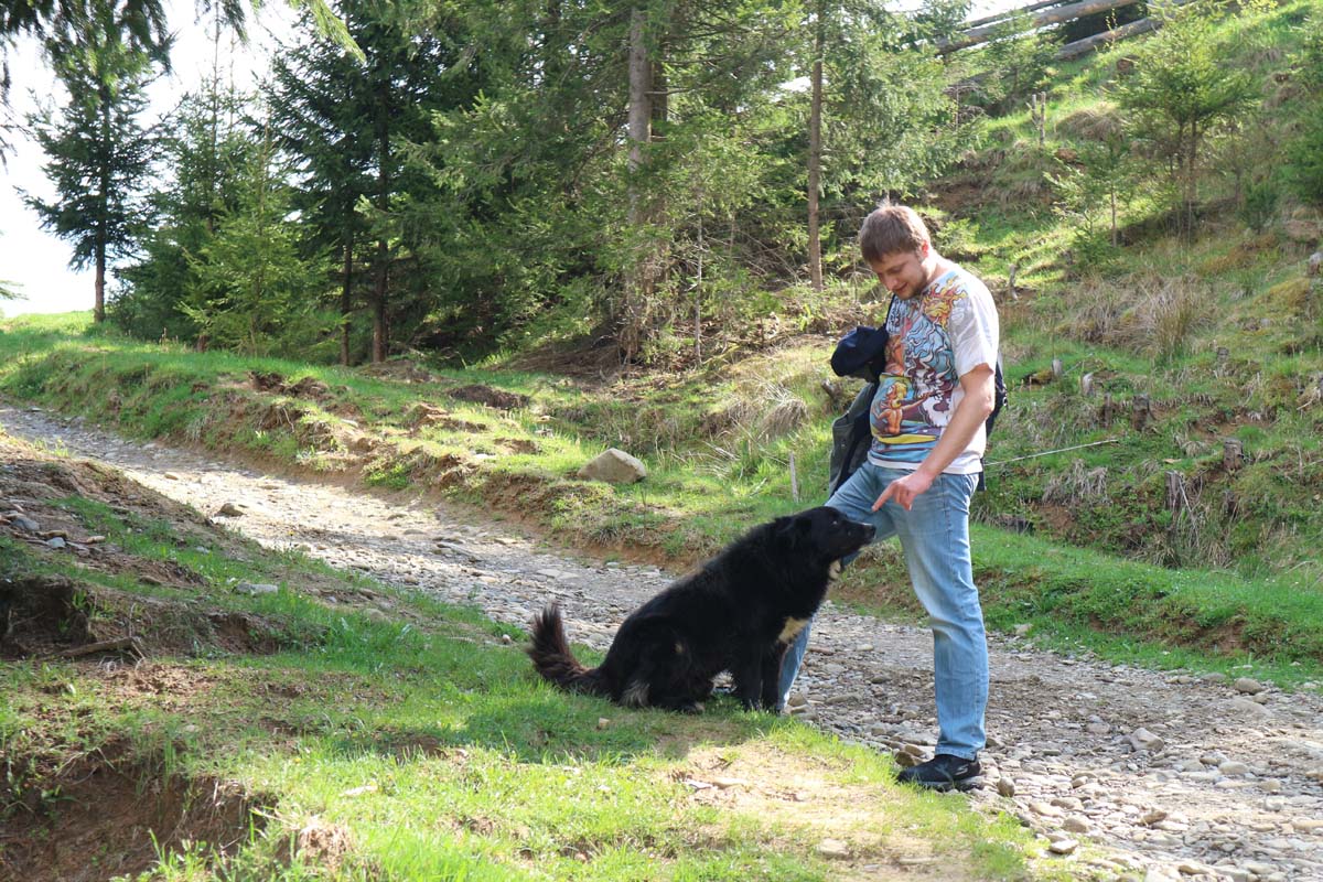 Це, мабуть, наше улюблене з Дашею, коли до нас у похід приєднуються собачки. Хоча тут я трохи сумнівався – чи не ведмідь за нами пішов. За розміром був схожим. Незважаючи на п’ятигодинну довжину нашого маршруту, було дуже легко. Адже будь-якої миті можна повалятися на сонячних галявинах. Мишко ніяк не міг зрозуміти чому собака йде з нами і навіщо йому це треба. Можливо собака на п’яту годину маршруту і сам ставив собі те саме питання, але кинути нас самих він не міг. Ще за що я люблю Карпати, якщо закінчується питна вода, то потрібно просто постукати в будь-який з будиночків і тобі наповнять пляшку.
