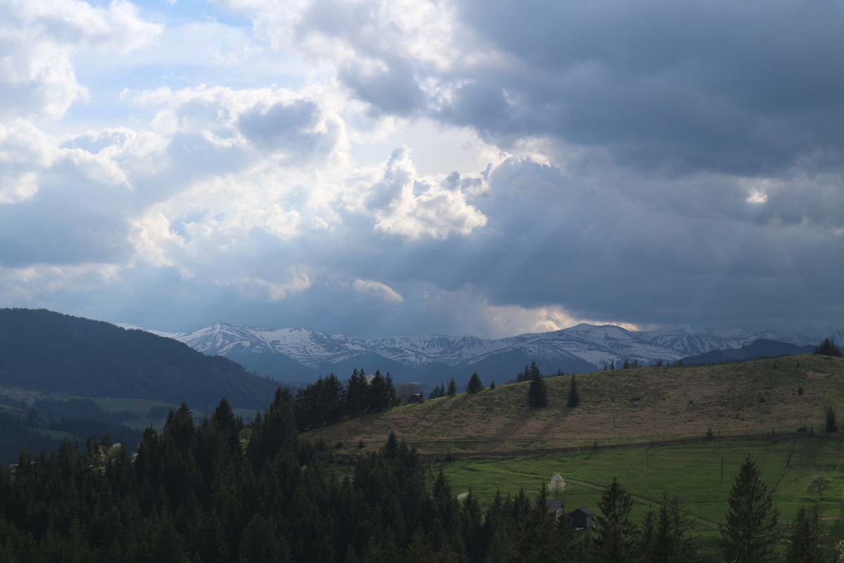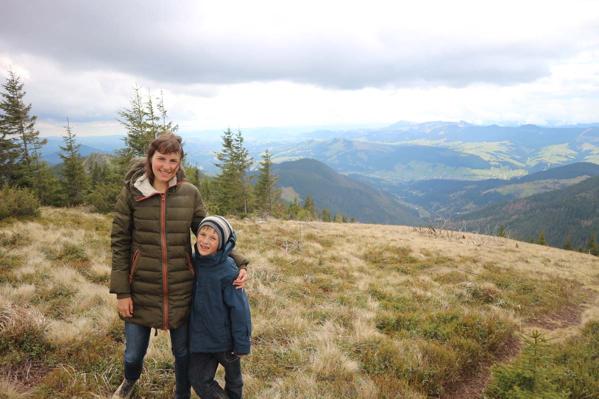 Ми пройшли хвилин 10 зворотного маршруту і на телефоні з’явився мобільний зв’язок. Я оновлюю прогноз і… Це не те щоб неймовірно, але зливи відклалися на 2:00 вперед. Уважно перевіряли ще раз прогноз. Як нам так щастить із погодою на цих травневих??? Дякую! Ми продовжуємо маршрут! Дощ закінчився і засвітило яскраве сонце! На висоті 1500 метрів нас чекала нагорода – панорама на всі висотні гори, включаючи Говерлу! Мишко мріяв побачити Говерлу і ось воно, дитяча мрія збулася! До речі, останні сто метрів нагору були ну з дуже великим нахилом.