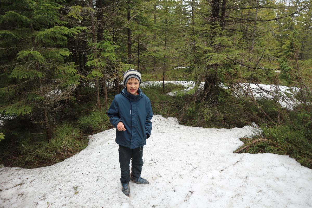 Шкода, не взяли рукавички, можна було б зліпити сніговика. Види чудові! Це найкрасивіша гора в околицях Верховини! Місія виконана, вершина підкорена, новий Мішин рекорд! Часу перевести дух не було, з боку гір насувалася дощова хмара, яка огортала все на своєму шляху. Терміново спускаємось!