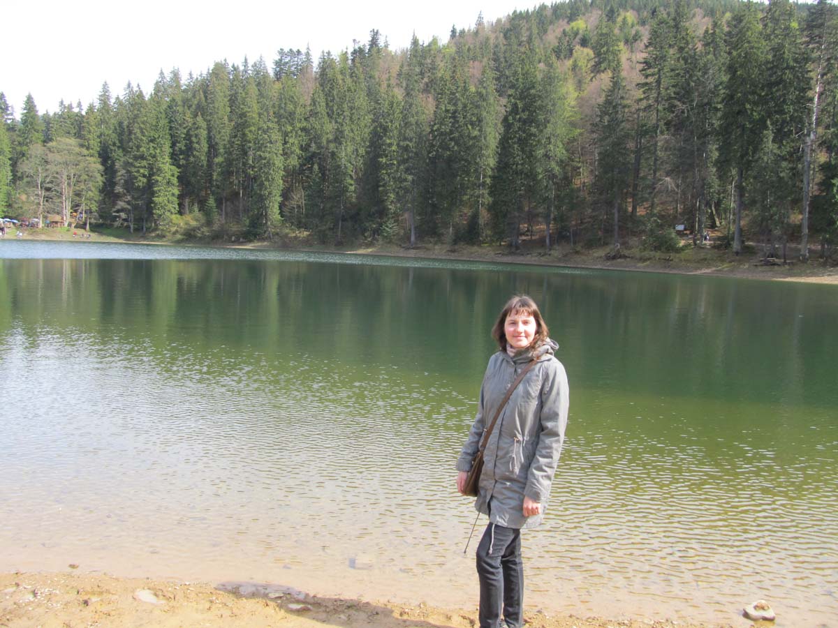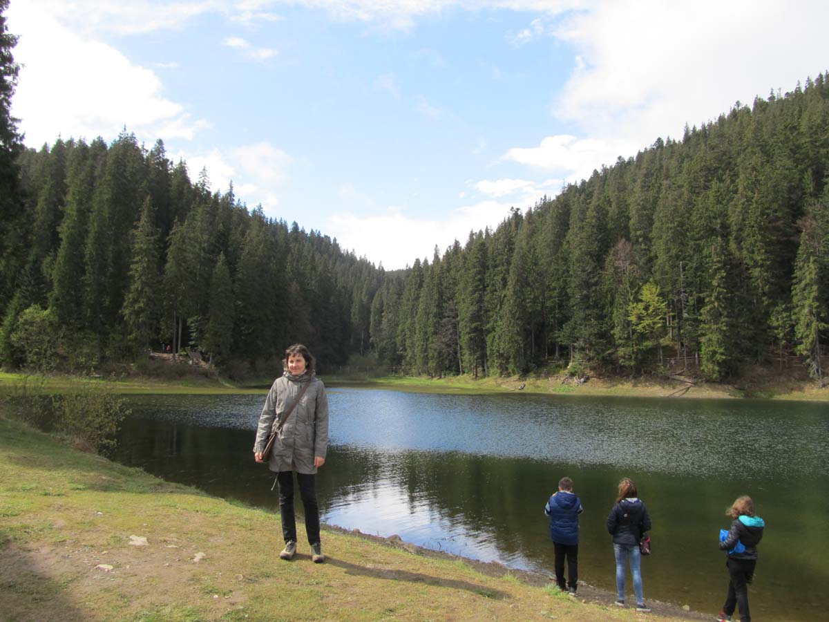 Давно була мрія побачити його. Але дістатися до нього з Києва, те саме, що в Перу до важкодоступного Мачу Пікчу, хіба трохи легше і дешевше. Таксисти кримінального вигляду заряджали ціни від 300–350 грн. Звідки узялися такі таксисти з такими цінами в цьому світі добра? Ми відморозились від таксистів і перша попутка нас сама підібрала, водій проїжджаючи запитав чи не на Синевир нам, йому частину дороги було з нами по дорозі. Супер, з ним півдороги приблизно проїдемо. Водій розповідав, як він не перетравлює таксистів, і всупереч їм підвозить людей. На бензин із нас взяли “по 10 грн з носа”. Далі ми пішли пішки, сподіваючись, що нас ще хтось підвезе. Тут же, на перехресті зустріли трьох велосипедистів, які прямували в той самий бік і в нас почалися своєрідні перегони, хто буде першим. Поки вони пакували свої речі в багажники велосипедів, ми вирвалися вперед. Погода почала псуватися, крім дощу, все ускладнювалося поривчастим вітром. У той час, коли ми боролися з парасолькою, велосипедисти нас красиво обігнали, далі ми наздогнали їх, коли вони спробували вдягти в дощовики. І знову ми були попереду. Звичайно, не минуло й 5 хвилин, як вони вже задоволені проїжджають повз нас. І за хвилин 5 ми спостерігаємо їх біля джерела, що набирають воду. Ми махаємо їм рукою і знову обганяємо їх. А після цього сталося те, що визначило нашу перемогу – нас підхопила машина! Сім’я з Ужгорода їхала на Синевир та вирішила нас врятувати від дощу. Потім, біля озера, за годину, як ми там гуляли, ми побачили їх знову і весело привітали один одного.