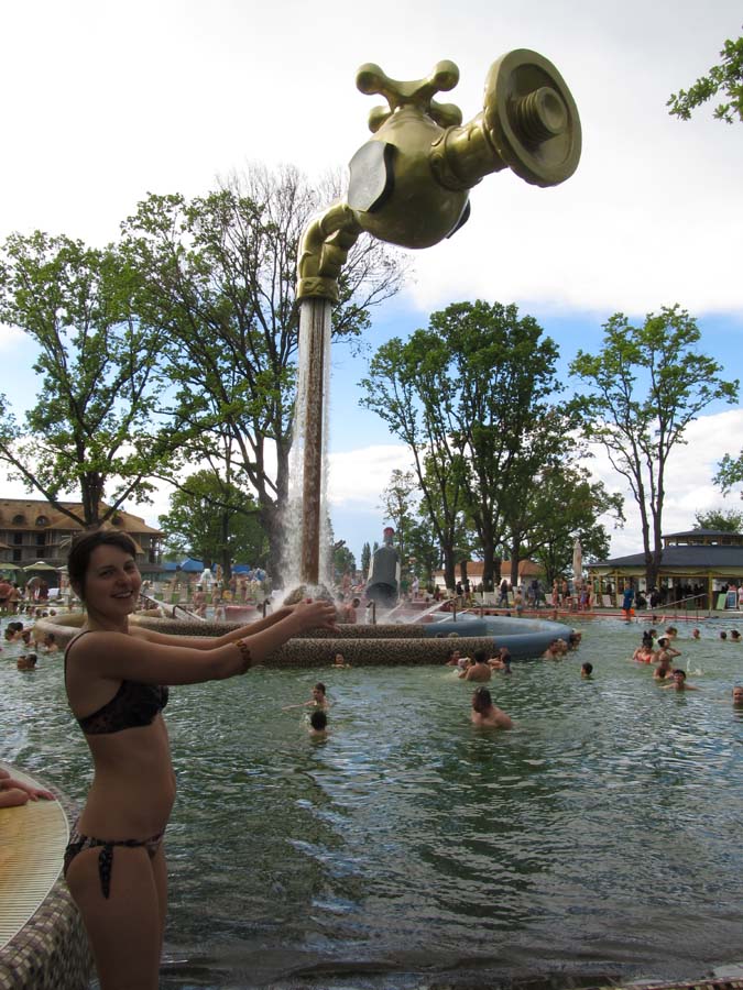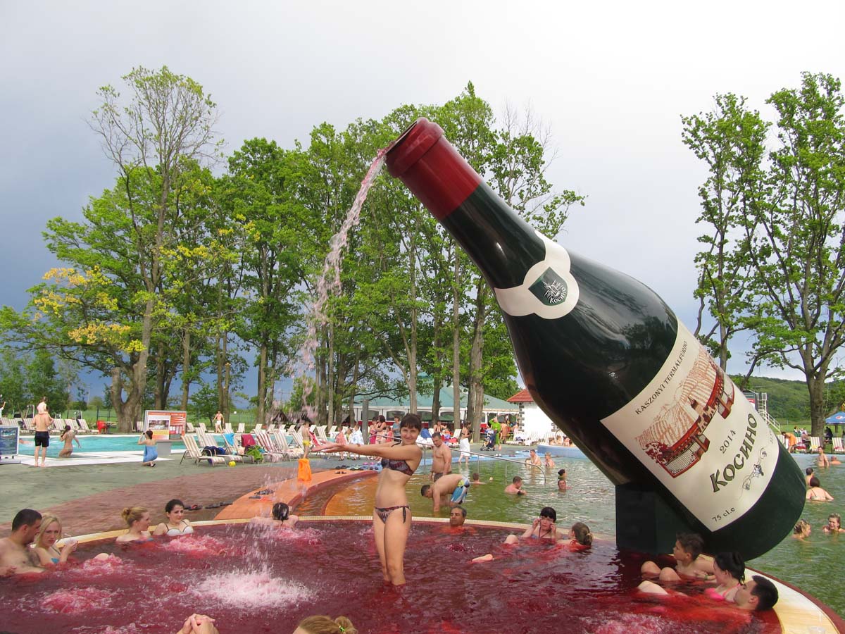 Зі щедрого кубка лилося пиво, заливаючи термальний басейн до верху і переповнюючи його. Від води йшов пивний запах, атмосфера була на сто зі ста. Після пивного басейну, ми плавали в червоному вині дуже гарного врожаю, аромат був прикольний.