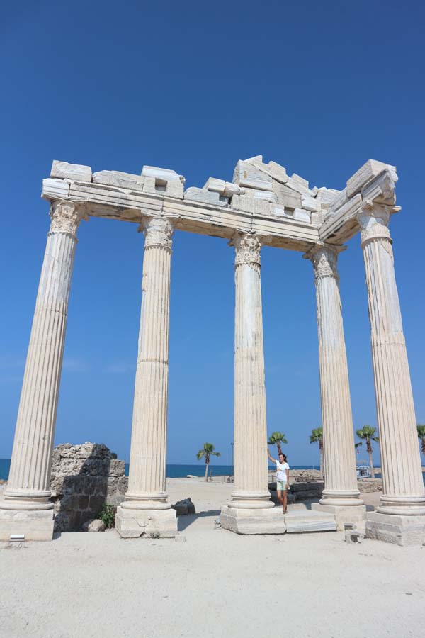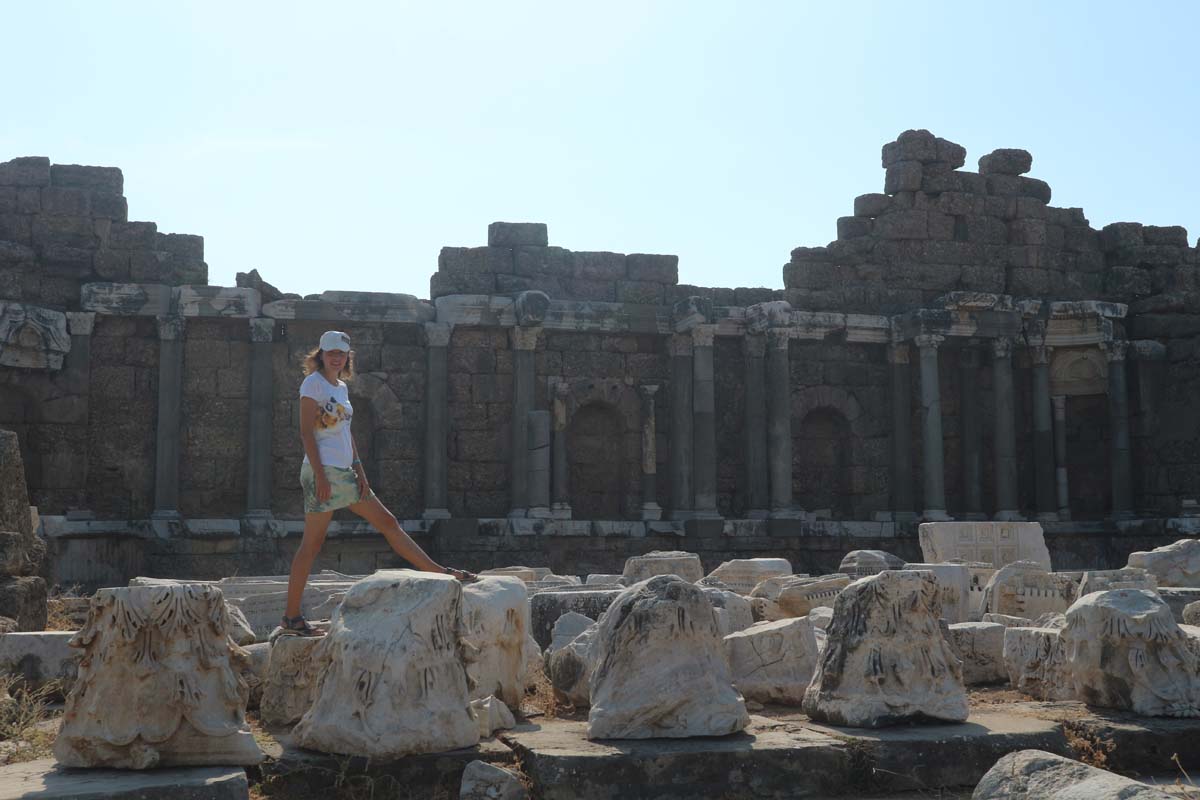 Другий плюс — це те, що ми тут на тиждень, а потім поїдемо на прекрасні моря далі. До мінусів відноситься некрасивий колір піску, який каламутить воду, упереміш з гострим камінням і рибою, що кусається. Ми гуляли набережною до старого міста Сіде, і я не сказав би, що колір води якось змінювався від готелю до готелю. Загалом любителям моря потрібно вибирати красивіші курорти Туреччини. А ось набережна тут виглядає справді круто. Відразу було бажання бігти назад у готель, переодягатися і вирушати в довгий шлях до старого міста. Мишко вирішив пропустити цей похід і залишитися з ноутбуком у номері. Пішки по набережній потрібно було йти близько години, а нагородою в кінці маршруту туристів чекає еталонно красиве старе місто. Тут було багато цікавих, невеликих ресторанів, які переплітаються з тематичними сувенірними магазинами та дивними руїнами. Особливо сподобалося місце, де бурхливе нічне море підсвічується яскравими кольорами.