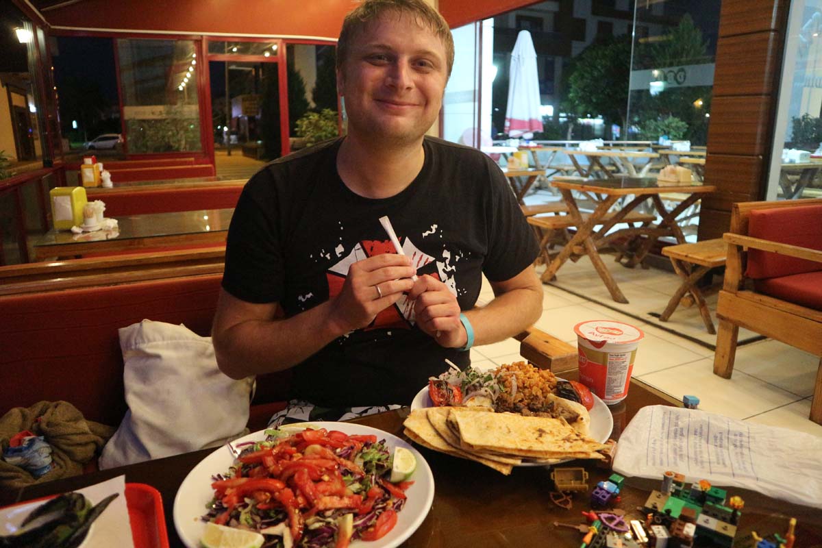 Зовні він не виглядав особливо і без зазивал, мабуть, це і не привабило туристів. На щастя, у Туреччині смачно готують практично скрізь, незалежно від рівня ресторану. Тож під час епідемії у нас був свій особистий ресторан, у якому ми душевно потрапезували.