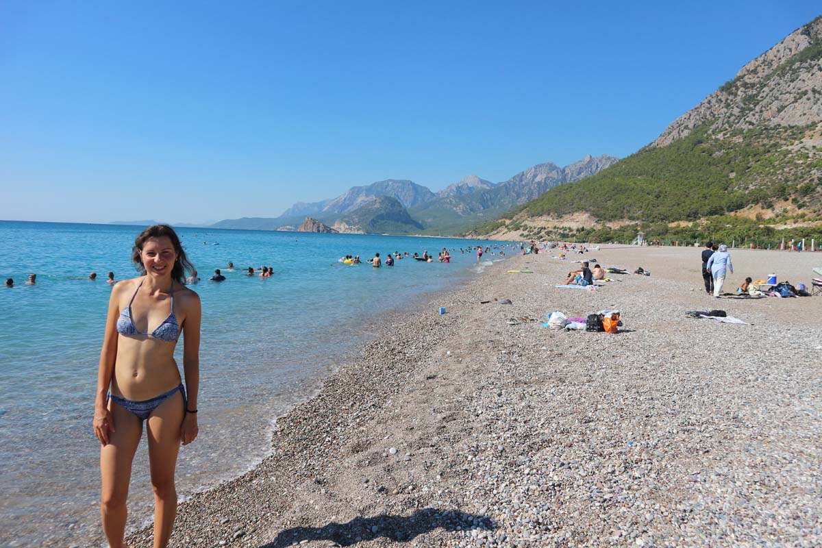 Після Сіде ми стали великими експертами з кольору моря. Тепер ми знаємо, що в цій частині Туреччини якщо пляж з гальки, то море буде красиве, якщо з піску, то ближче до кольору “Євпаторія-78”. Оскільки на останній варіант ми надивилися вже достатньо, то вирішили жити ближче до красивого пляжу Коньяалти. А найоптимальніше за ціною житло ще й виявилося з віддаленого від центру боку пляжу.Так що добиралися ми довго і нудно. Зате район виявився затишним, навіть не вірилося, що це ще вважається містом Анталією.
