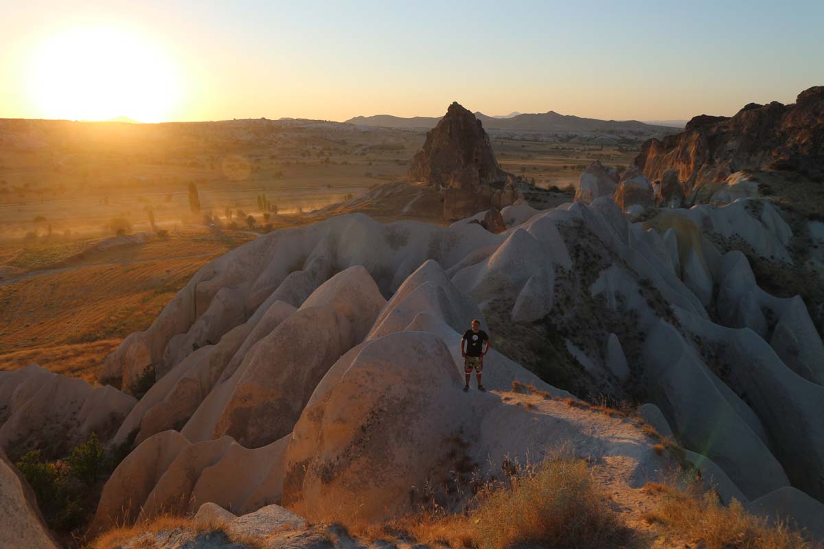 Наприкінці маршруту на нас чекав чарівний захід сонця на вершині однієї з гір. Пили, звичайно, непомірно і є ризик, що це буде остання поїздка біля фотоапарата, він уже повністю під колір гір. Але воно того варте. Тримайся наш фотоапарат, тримайся! Пам’ятаю, що рік тому його теж у Каппадокії довелося відкачувати.