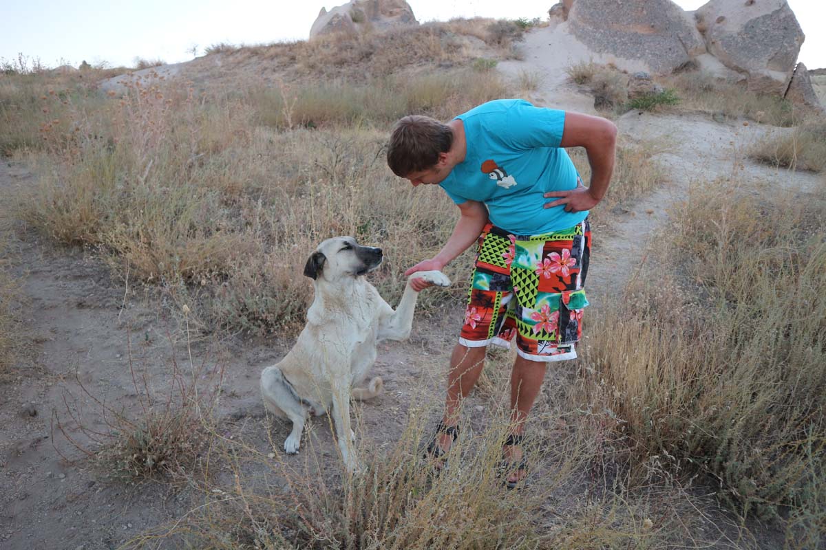 Просто скажу, що вона така прекрасна і навіть наш новий чотирилапий провідник виявив доблесть і зробив стрибок зі сходів у долині, щоб пройти далі з нами. Ми тримали курс на Чавушин. Якоїсь миті ми помітили, що собака вже інший. Дуже схожий, але хвіст і шерсть на голові не такі, як у першого. Гей, так не чесно, де наш вірний друг, який заслуговує на ласощі в місті? Мабуть, він не любить Чавушин. Цього разу у місті ми були першими туристами та взагалі живими душами. Була тільки восьма ранку і все ще спали. Навіть скеля-фортеця була повністю нашою. У готелі через 30 хвилин розпочнеться сніданок, можна розпочинати дорогу додому. Ми вийшли на трасу та дізналися, що автобус, який ходить раз на годину, поїхав 59 хвилин тому. Це була гарна новина. Поганою новиною було те, що за цю годину в наступний набилося стільки людей… Якось під час епідемії не хочеться таких ризиків. Але пішки до Гьореме теж немає ніякого бажання йти по трасі. Зайшли в масках на задні двері, і причаїлися на самих сходах, далі від усіх. Завдання зводиться до простого — не дихати близько 8 хвилин. Як тільки автобус від’їхав, люди почали одразу кашляти. У мене є підозра, що маски на обличчях сприяють тому, що люди починають закашлюватися. Я ще помітив турецьку традицію, що будь-який таксист під час поїздки повинен рівно два рази прокашлятися. Без цього дорога не складеться. Вийшли у Гьореме, можна дихати! О! Якраз кафе з бореками поряд. Хлопець сказав, що свіжі бореки будуть готові за 7 хвилин, а поки що ми можемо попити турецького чаю за рахунок закладу, щоб скоротати очікування! Я ще більше закохався у цей світ. Після сніданку ми поїхали на таксі до Учхисара, звідти можна долиною Голубів повернутися в готель. Якщо почати з Учхисара, то дорога буде весь час вниз, легко, навіть мапа не потрібна. Але, на жаль, моя самовпевненість дала збій, і ми заблукали в цій чудовій долині.
