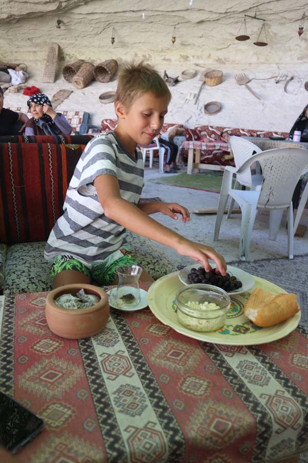 Я не сказав би, що це було у великий мінус, але сьогодні було зовсім спекотно, а нам довелося потім йти багато вгору. На вершині в скелі на нас чекала дуже затишна кафешка. Точніше, це місце, де мешкає велика родина з бабусями і за сумісництвом вони приймають туристів. Зараз же всі Tea House в долині були закриті, а в цій просто жили власники. Втомлених туристів із радістю прийняла вся турецька родина. Вони змогли нам запропонувати каву та чай, на цьому наш турецький словниковий запас закінчився). Між собою мою каву вони називали бурдою. Я намагався пояснити, що таке печиво, але згадав тільки хліб турецькою. Цього вистачило, щоб нас почастували хлібом, виноградом та сиром, схожим на пармезан.