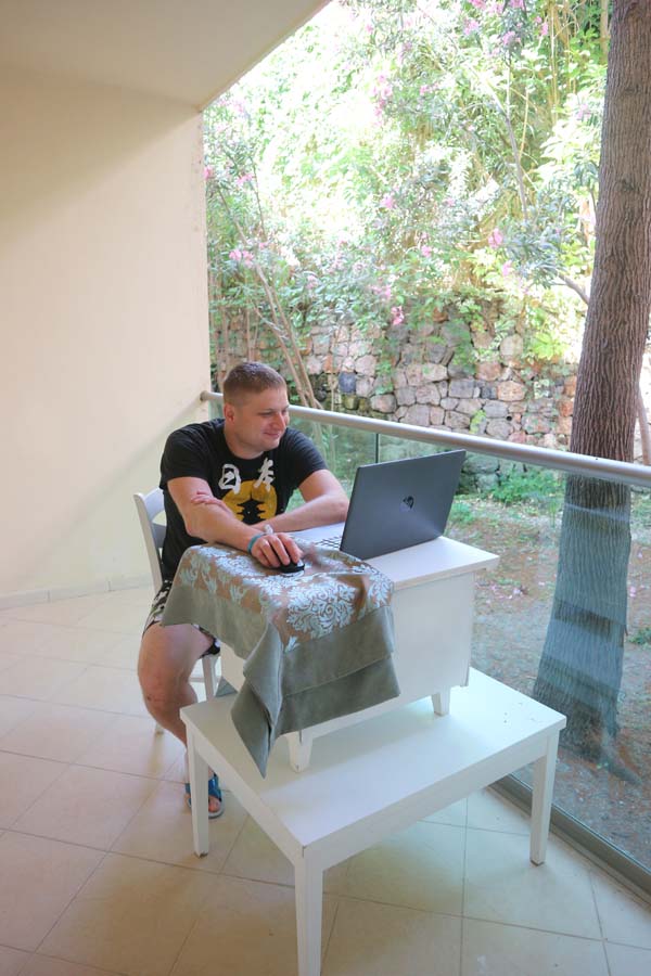 Район Егейського моря досить вітряний, тому кожна посадка супроводжується різкою турбулентністю та невеликим захитуванням. До яких я не можу звикнути. Після виходу з аеропорту на нас чекала довжелезна черга до стенду туроператора. Турецький туроператор вирішив продемонструвати чудеса техніки і замість того, щоб ручкою у себе в бланку відзначити туристів, що прилітають, вирішив кожному роздрукувати кольоровий фірмовий ваучер з фотографією автобуса і необхідною інформацією, замість чорно-білих які були у всіх з собою. Але було дві проблеми, на весь літак був лише один кольоровий і дуже повільний принтер, а оскільки номер автобуса забули дофотошопити, то після друку ваучер потрібно було заповнювати ручкою. Далі цей ваучер нам потрібно було викинути, оскільки готель та трансфер працювали не за ваучерами, а за своїми списками. Я не знаю скільки років ми простояли в цій ковідній черзі, але ми були абсолютно спокійні, тому що у нас ще 45 днів попереду. Тільки теща повертається додому через тиждень, натомість у неї у зворотному літаку буде відразу 4 місця. Я намагався вмовити її продовжити маршрут разом із нами, щоб побачити Туреччину з усіх ракурсів, але курочки, собака, господарство тощо. Дорога до Бодрума була надзвичайно красива, таких соковитих кольорів моря ми вже давно не бачили. Тож перші моменти знайомства з Егейським морем пройшли на ура. Ми приїхали до нашого першого готелю, легко заселилися, пообідали, я облаштував собі робочий куточок. Наразі все готове до трудових буднів.