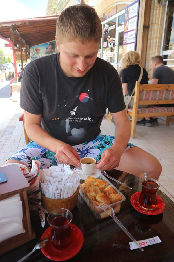 Це можливо перший випадок в історії наших подорожей, коли я схуд, мабуть, нерви, пов’язані з роботою, всі пригоди та фізичне навантаження на маршруті так далася взнаки. Але солодощів та літрів айрану за цю подорож було поглинено дійсно багато та це було дійсно чудово. З Аваноса ми вирішили поїхати до Ургюпа, він тут ніби зовсім близько. Але чомусь скільки ми не їхали, то по карті були все далі і далі, і далі, і далі. Коли ми проїхали повз наш готель у Гьореме, то запідозрили недобре. Причому нам водій сказав, що він їде в Ургюп, а якомусь турку щось ще турецькою додав і той не сів. Ми зрештою проїхали всіма визначними пам’ятками околиць і таки вийшли в Ургюпі. Схоже, маршрутка була кільцева і ми просто поїхали не в той бік. Зате Мишко встиг знатно виспатися, поки ми їхали. Про те, як було чудово в Ургюпі пару днів тому я вже писав. Цього разу було не менш шикарно, містечко дійсно варте окремого відвідування. У нас навіть народився сімейний жарт на цю подорож. Іноді ми говорили одне одному слово «Ургюп» без жодного контексту. При цьому потрібно було дотримуватись максимально турецького акценту.