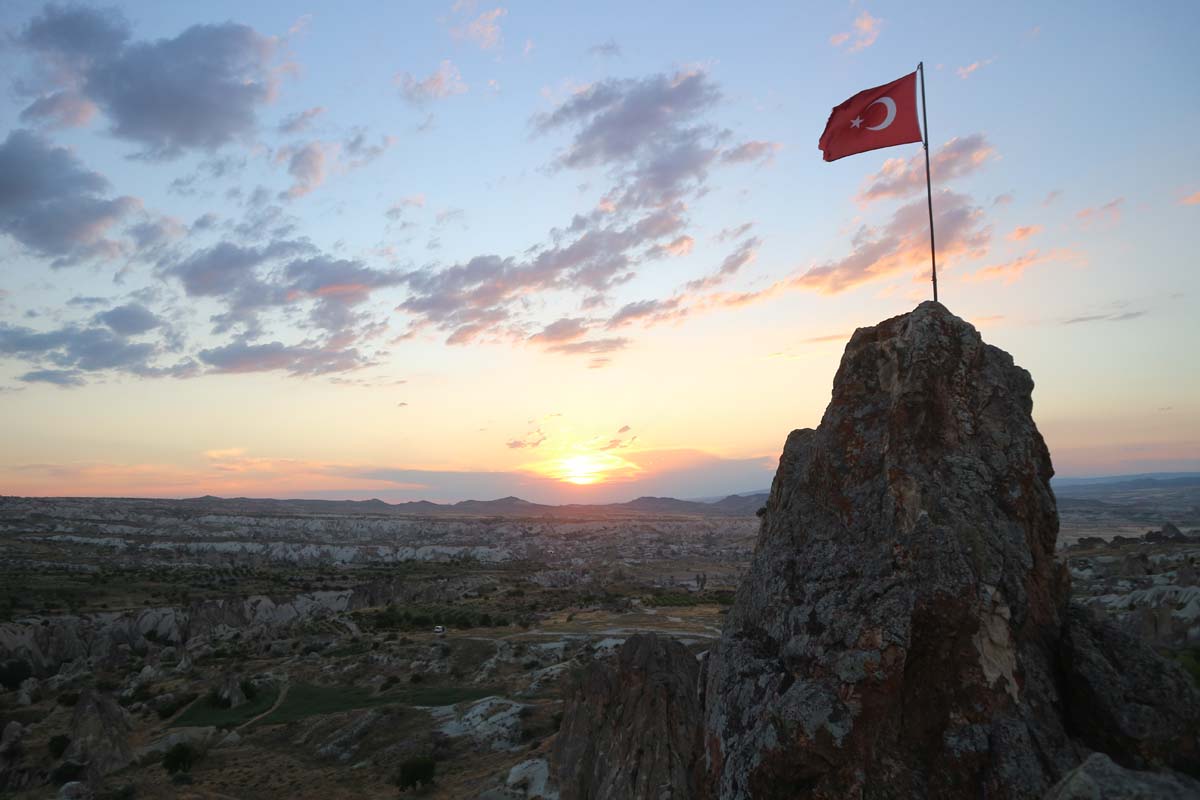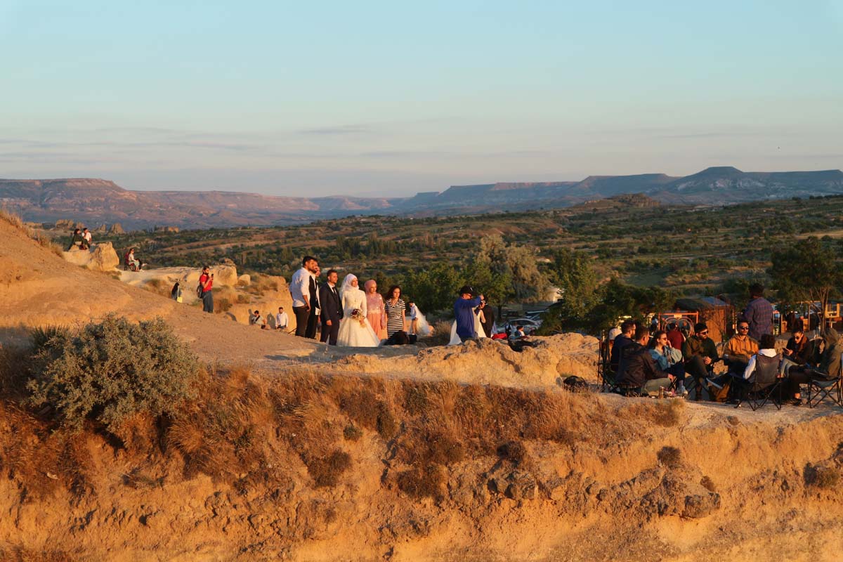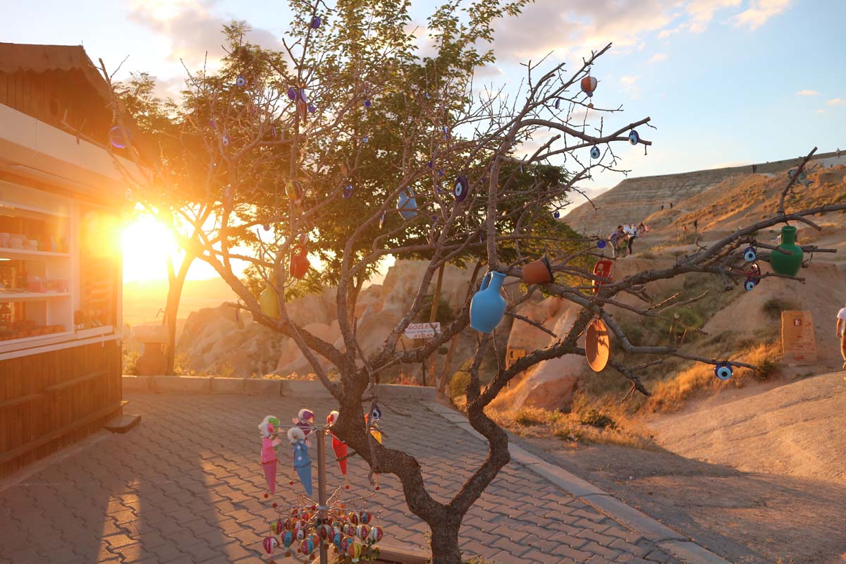 Це практично місцева візитна картка, до якої легко дістатись, але в нас ніяк не доходили руки. Ці стовпчики з шапочками настільки значущі, що поліція навіть просить надягати маски, щоб подивитися. Хоча в інших частинах регіону маскового режиму ми не спостерігали. Він ніби і є, але й водночас його немає. А тут прямо просять одягнути. Цього року щодо масочного режиму ми почували себе досить спокійно, оскільки в Туреччині на момент подорожі був уже досить великий відсоток вакцинованих людей. Захід сонця ми зустрічали на вершині однієї з гір недалеко від долини шабель.