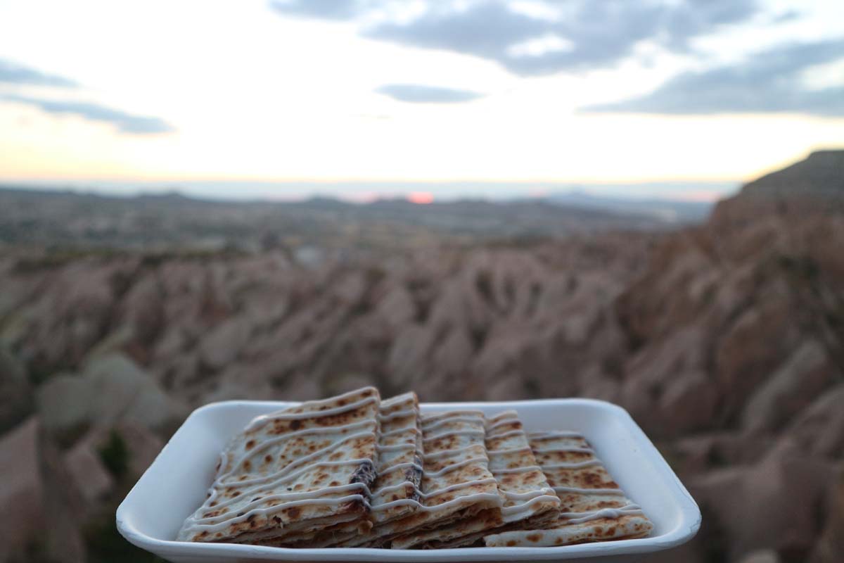 Сьогоднішній маршрут був ще найдальшим. Перед далекою дорогою ми вирішили взяти собі на пікнік свіжих бореків. Я залишився в машині, Даша повернулася з подарунковим чаєм від нашого старого друга, сьогодні нарешті почалися його зміни. Дашу хлопець не знав, але Даша його бачила і передала привітання від справжнього фаната його випічки, продавець за привітом відразу мене згадав і налив усім у дорогу чаю. Тепер усе готове, можна їхати. Долина знаходиться за 80 км від Гьореме. Перше, що ми побачили це долину з вершини.