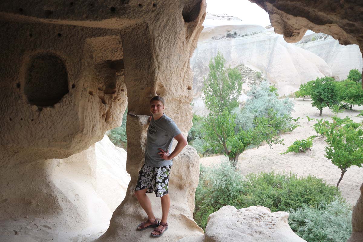 Тож для нас тепер “Ургюп” це повноцінна пропозиція під час розмови, яка в собі одразу розкриває суть питання та відповідає на нього ж. Наступного ранку ми почали з куль, оскільки попередню ніч міцно виспалися. Тільки ось кулі чомусь були спущені, але всі люди напоготові. Скільки ми не чекали на огляді, вони навіть не намагалися почати злітати. Я дізнався в одного з організаторів, що зараз сильний вітер у небі і всі чекають на зміни. До речі, перед польотом куль у небо пускають звичайні гелієві кульки і перевіряють як їх несе вітер. Ми найбільше переймалися людьми, які сюди приїхали на екскурсію з різних куточків Туреччини, а тут такий облом чекав. Але на щастя для всіх було дано сигнал і кулі почали готувати до зльоту зі швидкістю світла. Ми спостерігали наче у прискореному відео. Якщо вони так швидко можуть щоразу готувати кулі до запуску, то навіщо вони це роблять так повільно щоразу?)))) Після куль ми вирушили шукати ту легендарну печеру в Долині Кинджалів, яку відкрили Катя з Сашком. Пошуки були нелегкими, але ми-таки її знайшли, за що ще більше полюбили долину Кинджалів. Тепер можна зі спокійною душею повертатися до готелю на сніданок. Тато мені надіслав повідомлення знайти господаря готелю та передати привіт його синові, бо наші батьки потоваришували з господарем та подарували синові цукерки на День народження. Але коли ми вселялися, господаря не було. А коли ми сіли за сніданок до мене підійшов чоловік і здивовано в мене вдивлявся. Я запитав чи не Мурат він)))) Це і був Мурат — господар готелю. Він коли вранці переглядав відомості про постояльців готелю, то помітив моє прізвище та ім’я, яке повністю збігається з татом. Він подумав, що повернулися туристи, які нещодавно з’їхали та прийшов привітати їх. Але коли побачив мене, то не міг збагнути, що відбувається. Турист явно схожий, але не той самий)