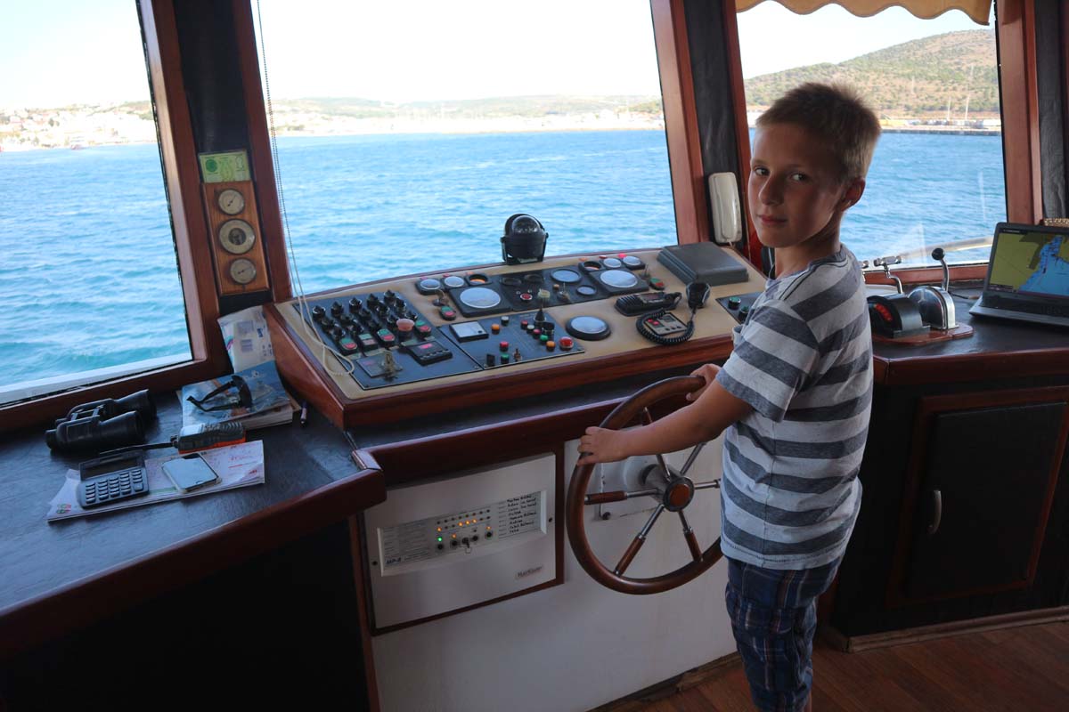 Як ви вже, напевно, помітили, кораблики — це наша сімейна пристрасть, ми любимо з Дашею кататися бухтами, а Мишко любить, коли капітан дає покермувати. Тут вирушати в бухти було ризиковано з тієї точки зору, що можна знову зловити холодне море. В принципі, наші побоювання підтвердилися. Воно було не критично холодним, але довго у воді не просидиш. Але що не змінюється незалежно від температури це прекрасний колір моря. Але це все за стандартом, давайте краще розповім, чим відрізняється кораблик в Чешме від інших корабликів Туреччини. Тут виходить танцювати танець живота чоловік. Танець я б охарактеризував фразою “Іспанський сором”.