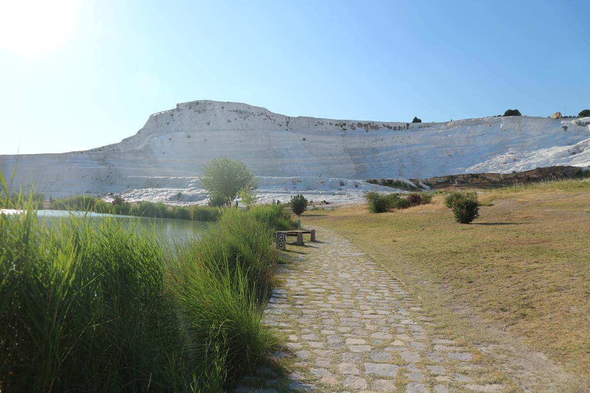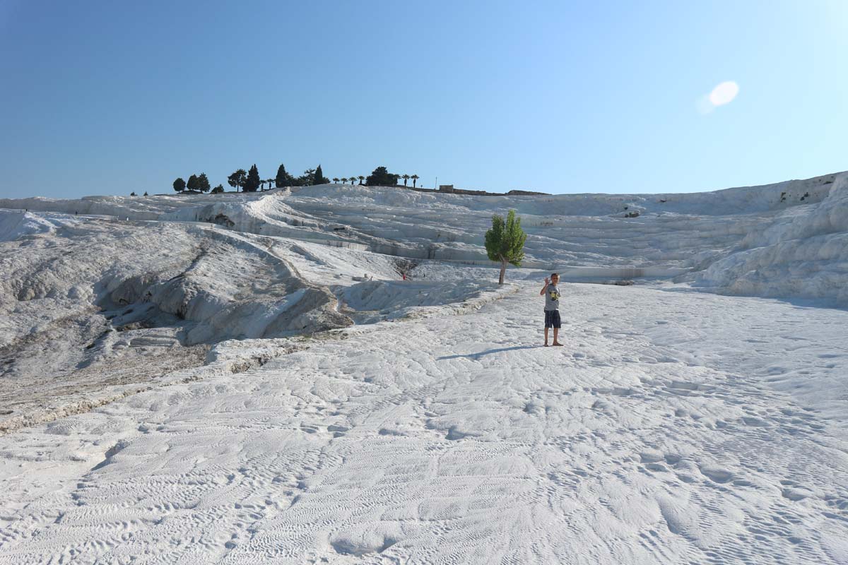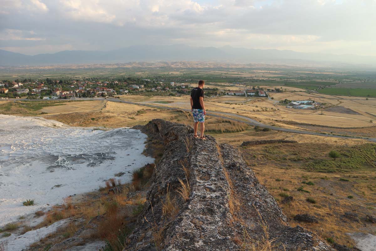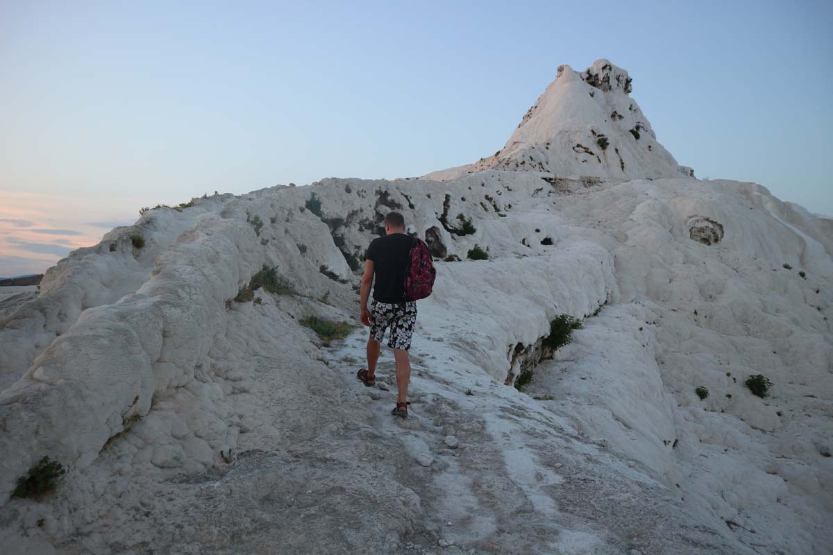 Це був той формат трапези, коли тебе задаровують комплементами і розлучаєшся з господаркою мало не обіймаючись. Михайло взагалі заявив, що заради цього ресторану хоче повернутися в Памуккале. Але знову-таки хто його знає, яким він буде через час. Наприклад, у Каппадокії з одного ресторану ми в цій поїздці “зняли золоту табличку”. А поки що всі наші вечері проходитимуть з краєвидом на знамениту гору. Ми вже приїжджали сюди колись в складі екскурсії, але це зовсім різні емоції пожити тут і приїхати на невеликий час екскурсією. Коли ти тут сам, тобі доступна біла гора цілодобово та з усіх боків, тобто не лише там, де прокладено маршрути. А гора тут виявилася чималою. Вже від першого вечірнього підйому ми були в повному захваті. Вечірнє сонце має тьмяно золотий відтінок, вся долина з гори виглядає як осінній пейзаж, намальований мазками олійних фарб на полотні.